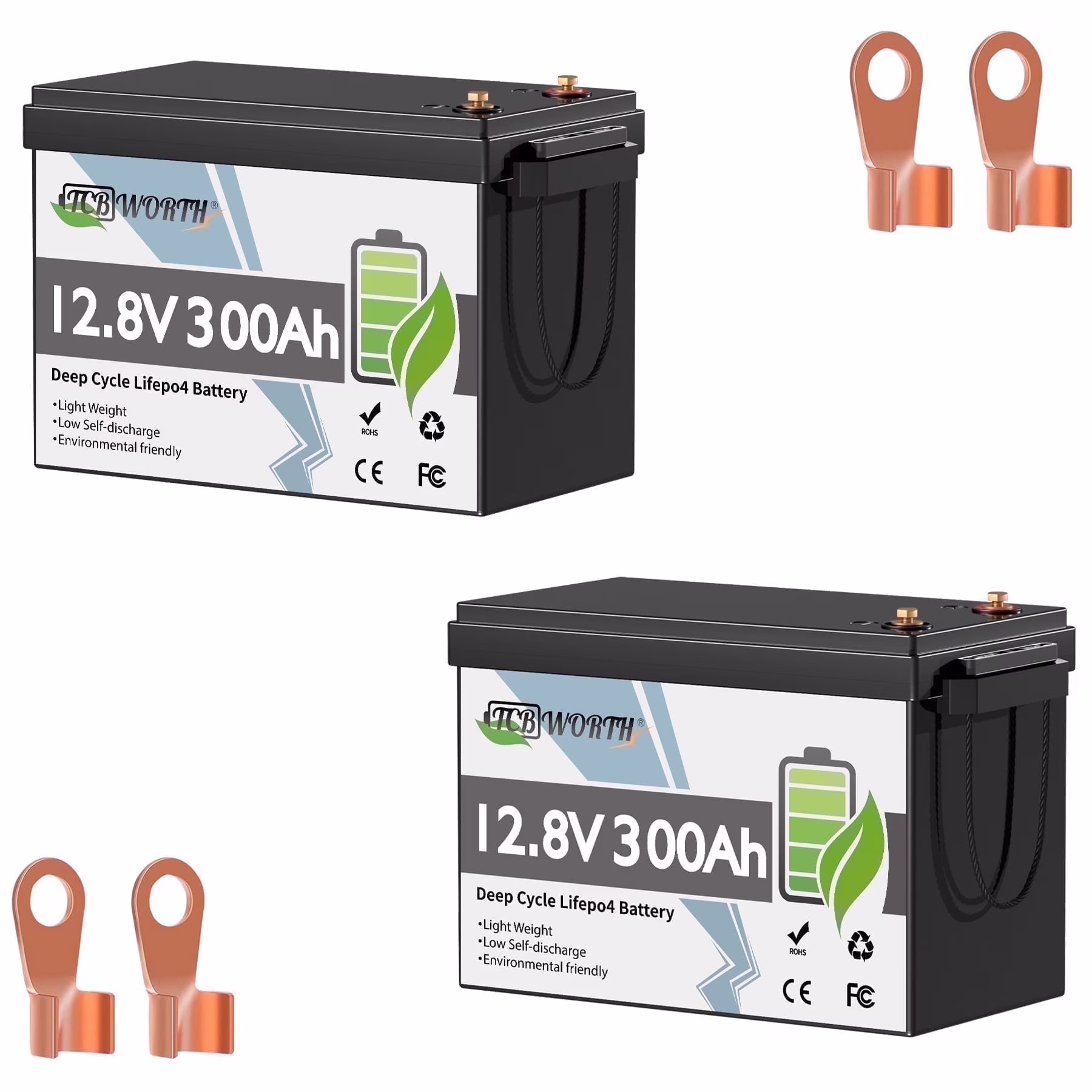 2Pack 12V 300Ah LiFePO4 Lithium Battery,TCBWORTH Batteries for RV,Solar,Marine,Camper,Home Energy Storage,Golf Carts,off-Grid,Built in 200A BMS,15000+ Deep Cycles
