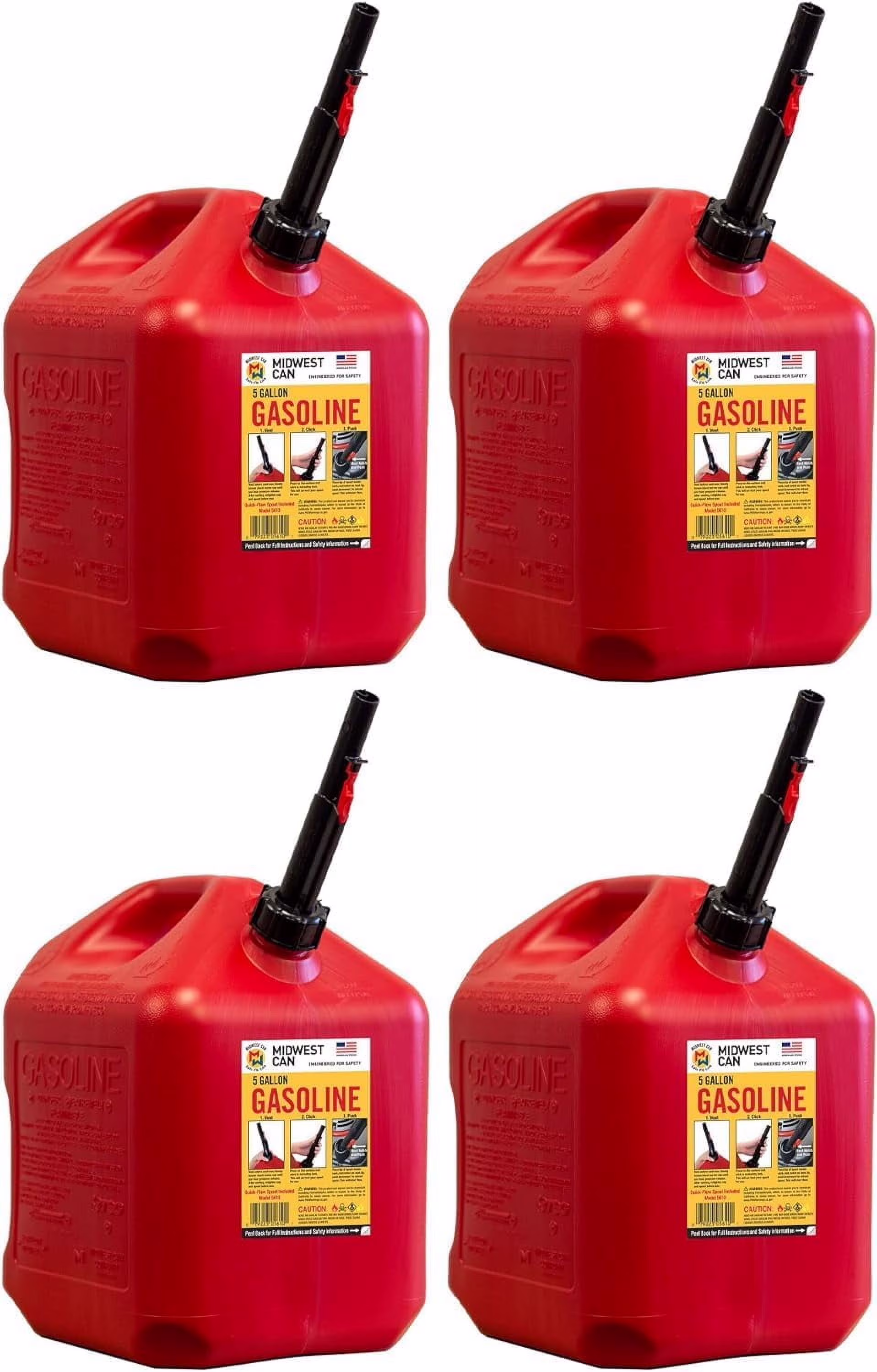 Midwest Can 5610 Safe-Flo Auto Shut Off 5 Gallon Gas Can �C Durable Fuel Containers with FlameShield Safety System & Quick-Flow Spout - Red - 4 Pack