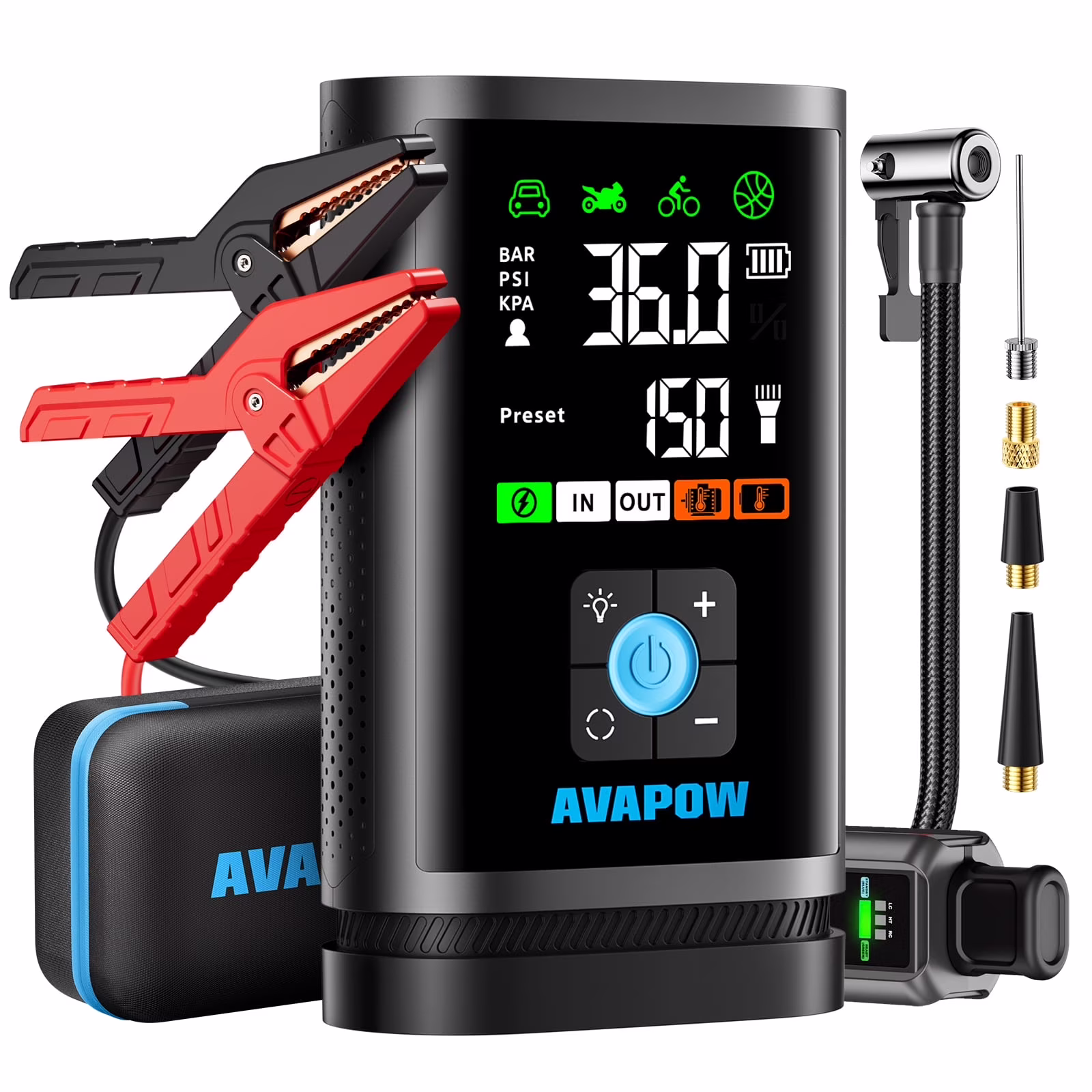 AVAPOW Car Jump Starter with Air Compressor, 12V 3000A Car Battery Jump Starter Pack (9.0L Gas/6.5L Diesel), 150PSI Tire Inflator with LCD Display & LED light