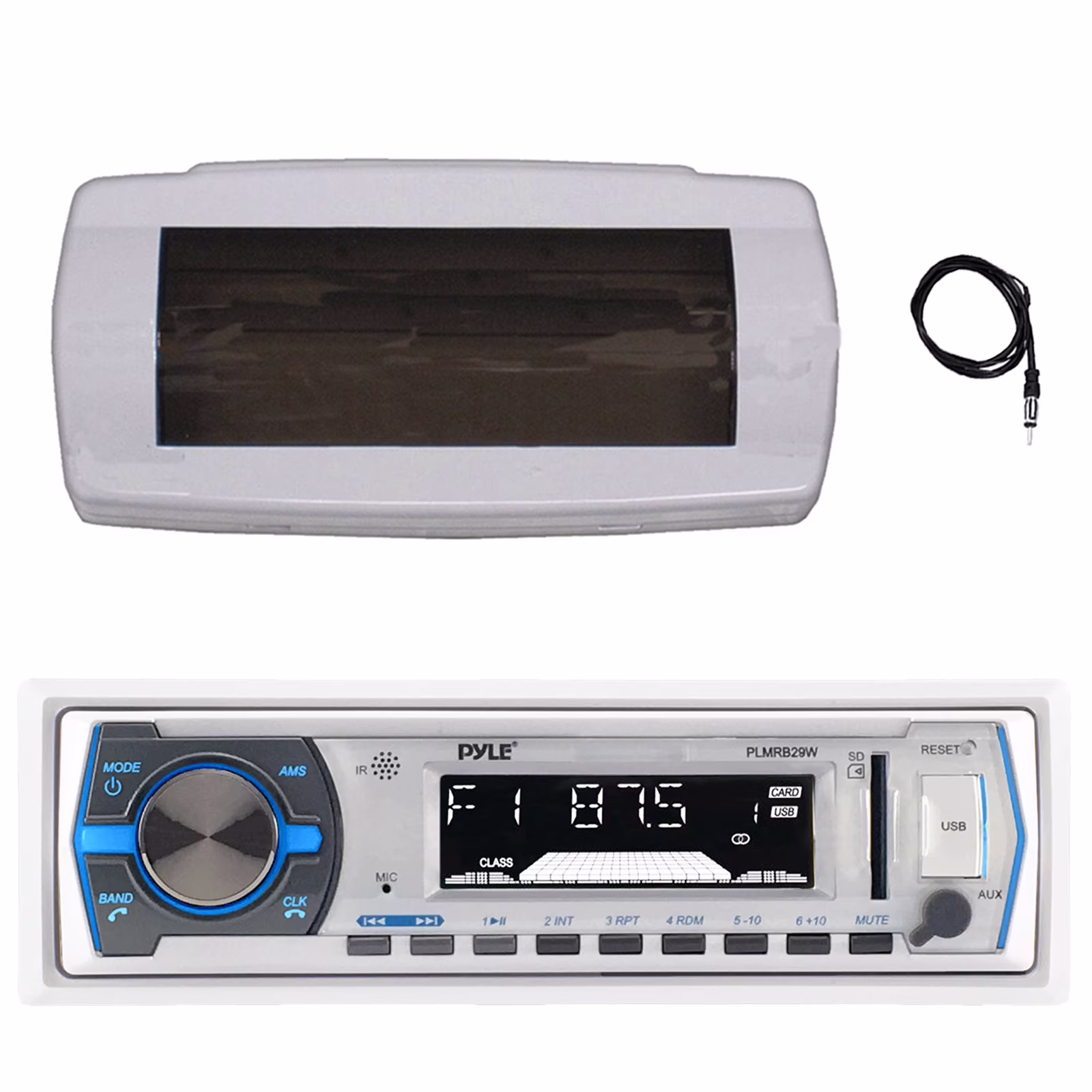 Pyle PLMRB29W Single DIN Bluetooth Marine MP3 AM/FM Stereo Receiver with White Splash Proof Radio Cover, 22" Antenna