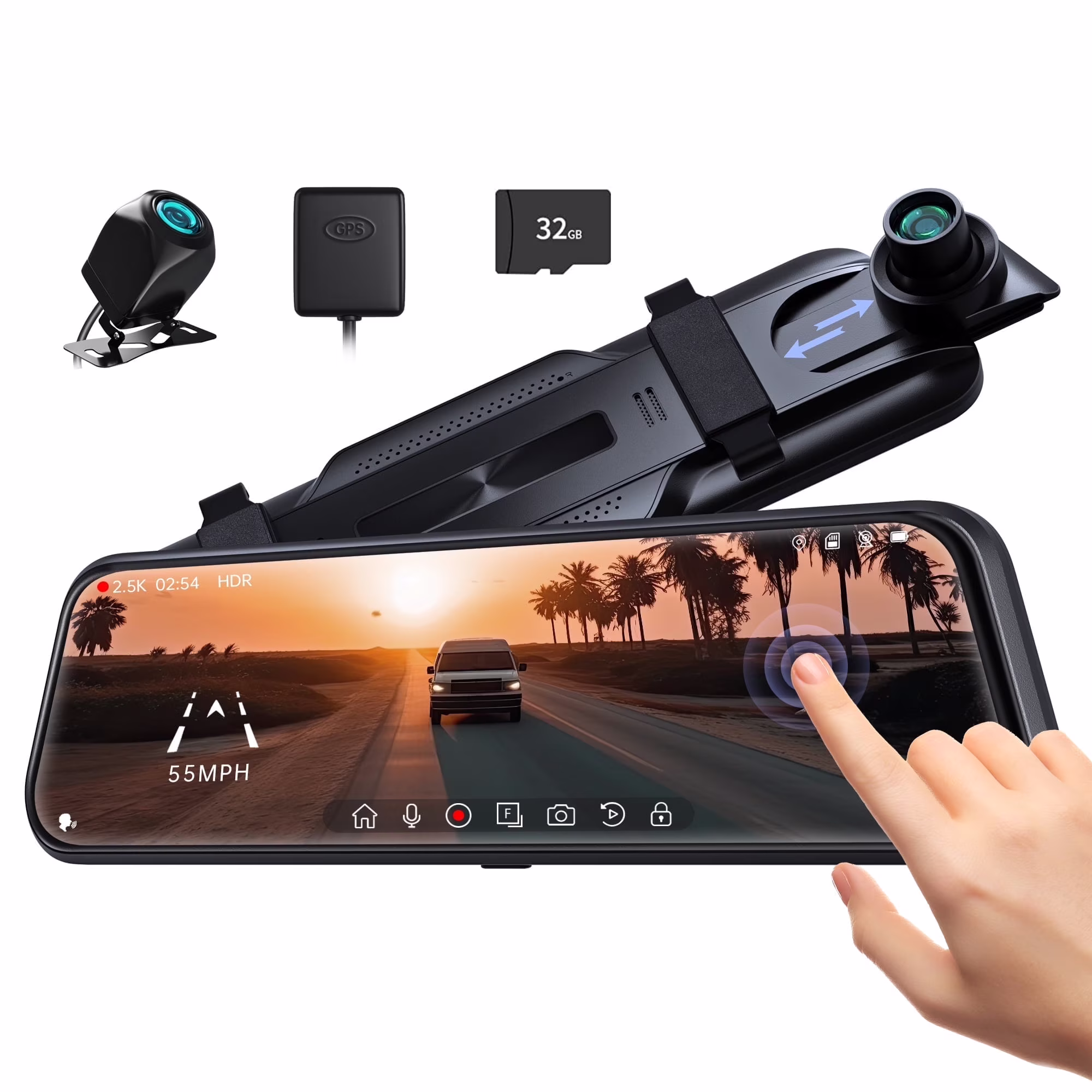 Pelsee 10" 2.5K Mirror Dash Cam, Touch Screen Front and Rear View Camera, Free 32GB Card, 24H Parking Monitor, Voice Control, Blind-spot Monitoring Systems with GPS Antenna