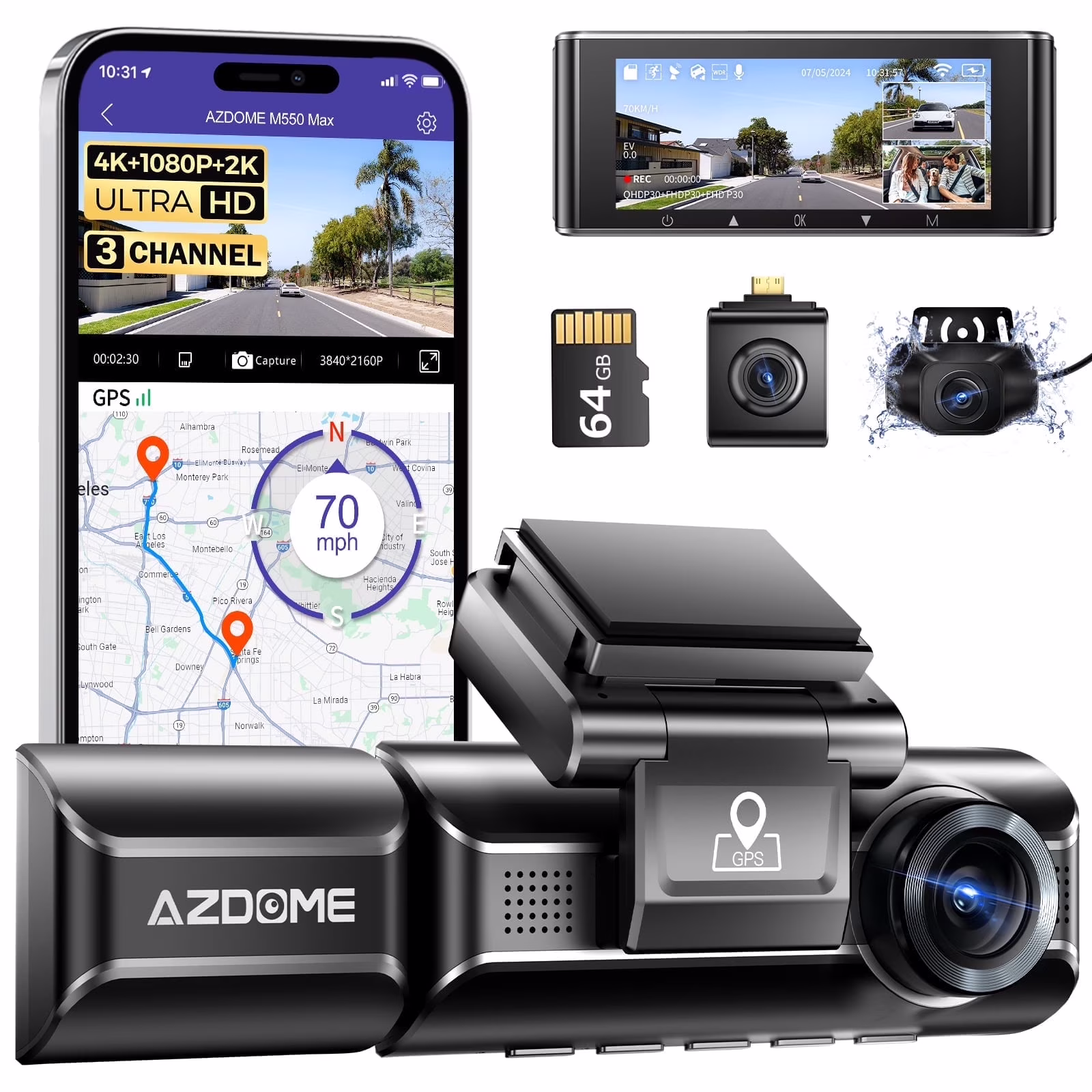 AZDOME Dash Cam 3 Channel with 4K WiFi , Resolution Supports up to 4k+1080P+2k, Built-in GPS 24H Parking Mode IR Night Vision WDR 3.19" IPS, Max to 256GB