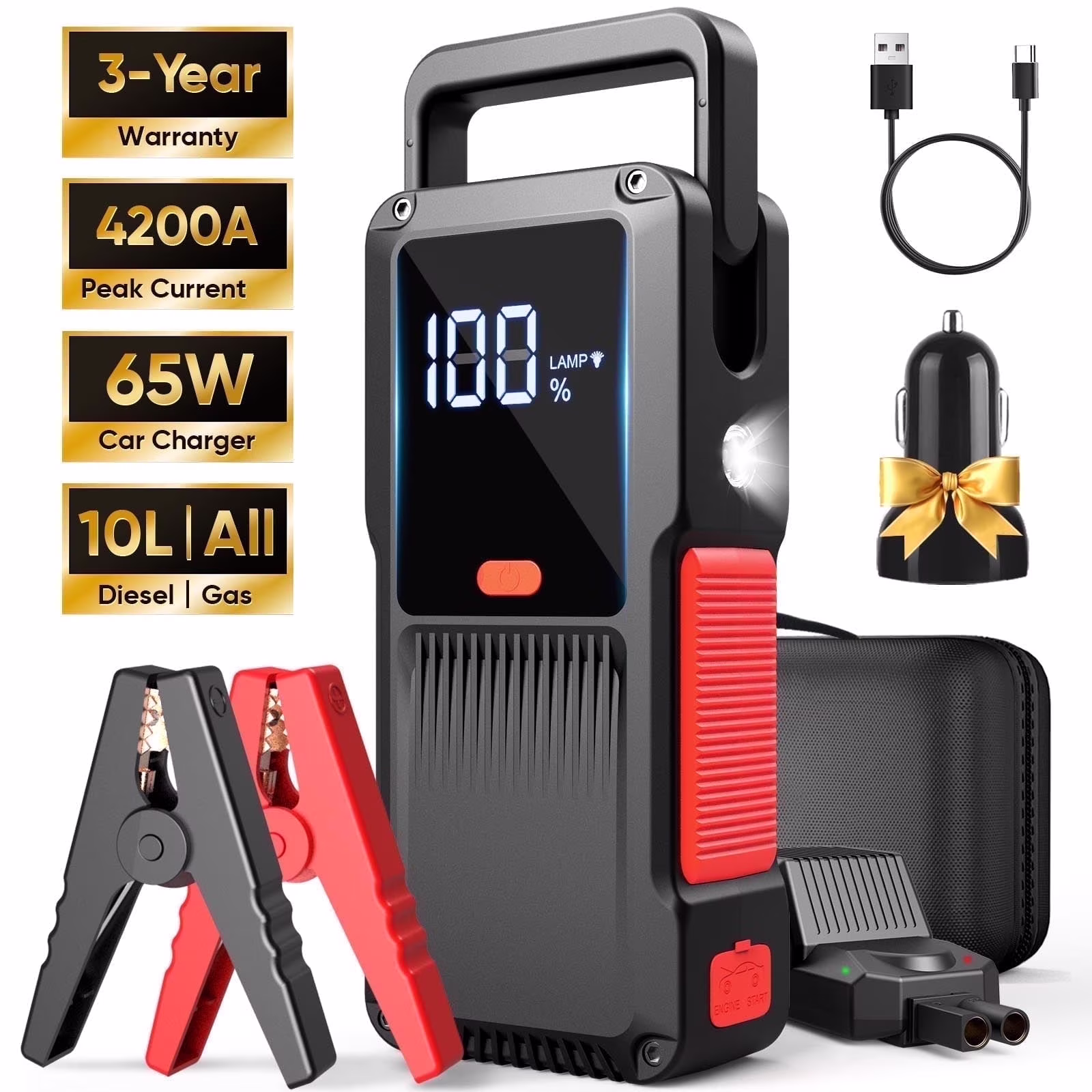 GCZ 4200A Peak Car Jump Starter for All Gas & 10L Diesel Engines, 27000mAh Portable Battery Booster with 65W Car Charger, LED Display & Lighting (3-Year Warranty)