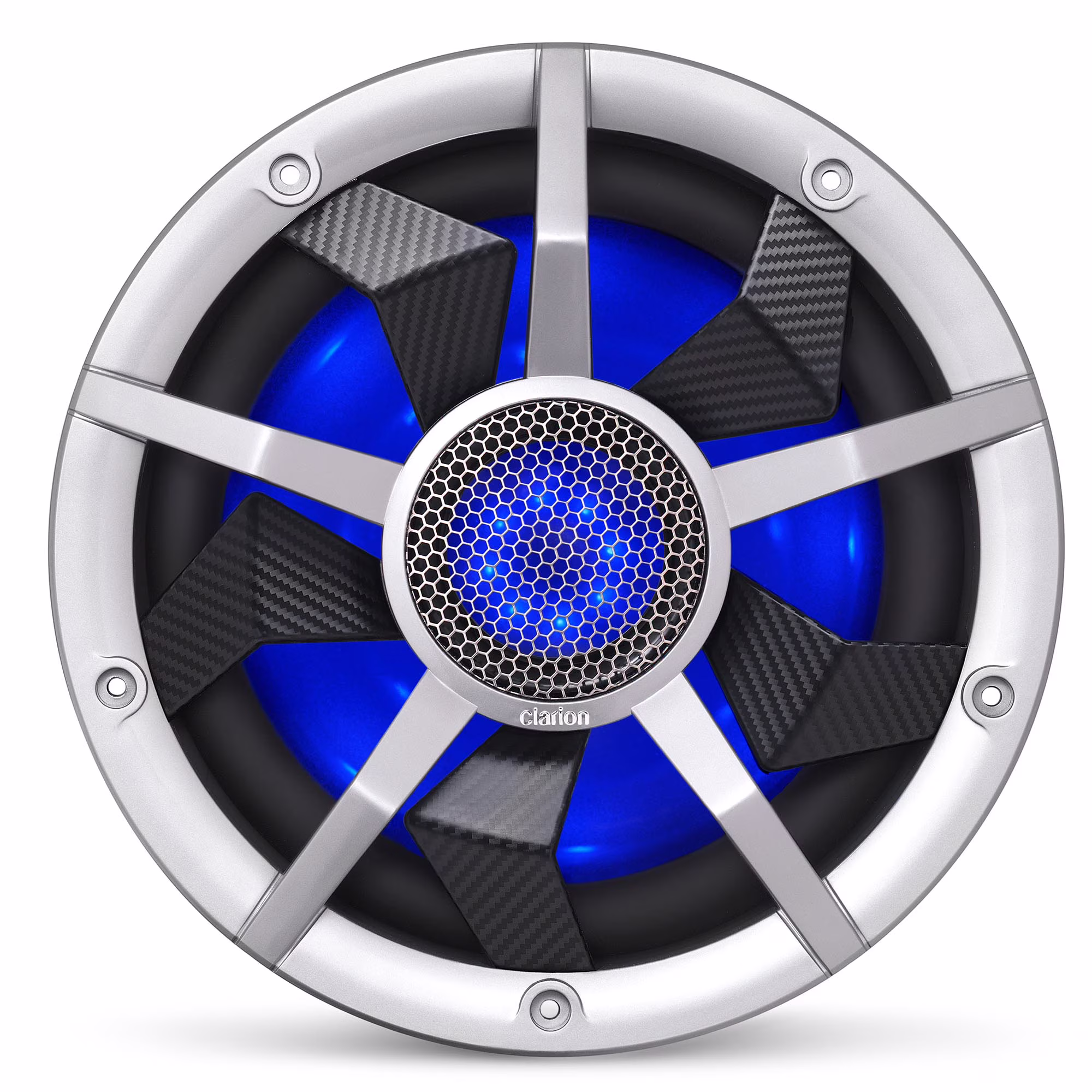 Clarion CM2513WL 10-inch Marine Subwoofer 250W RMS power handling Dual 2 ohm voice coils Built-in RGB illumination Includes Black & Silver Grilles