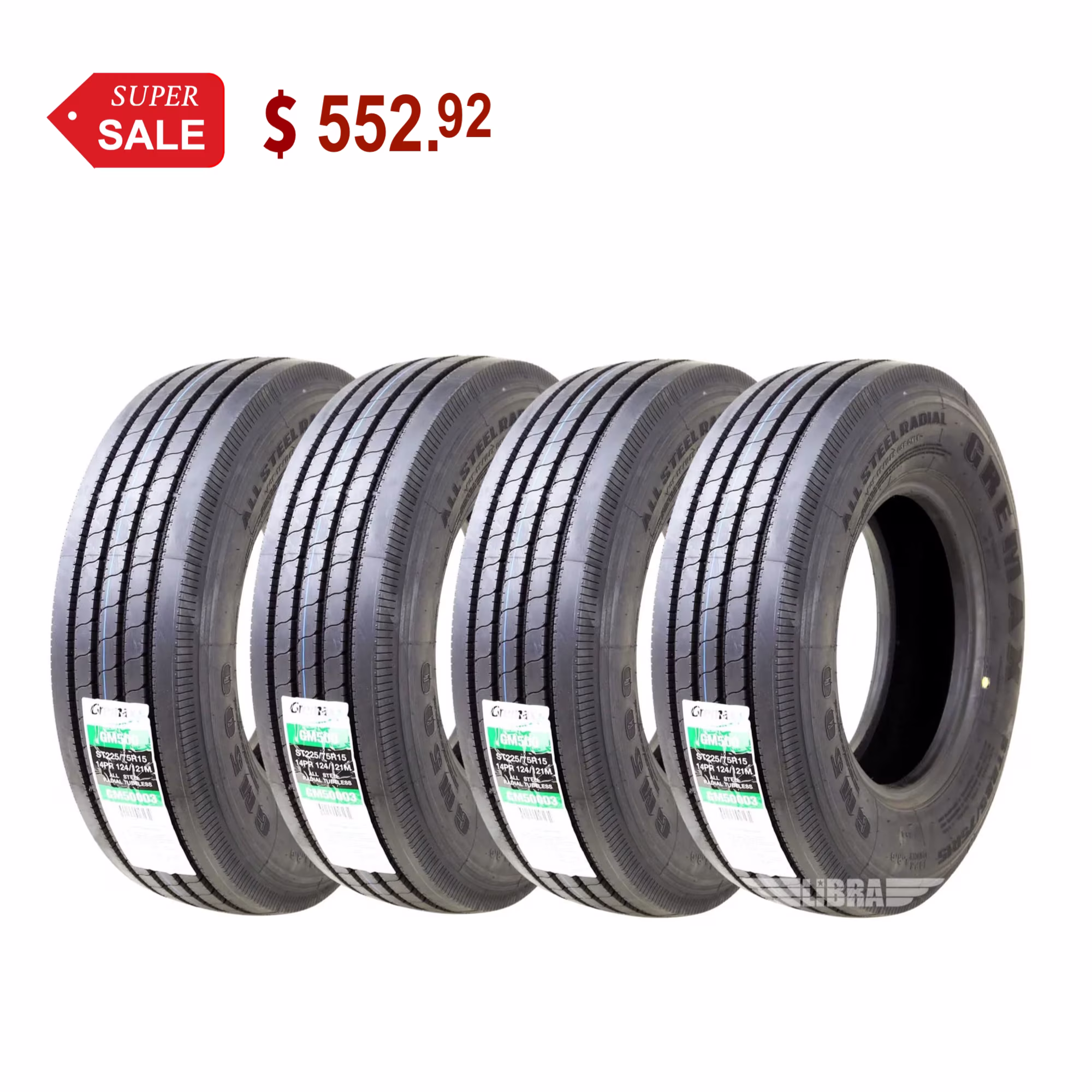 Gremax Heavy Duty All Steel Trailer Tires ST 225/75R15 14 Ply 124/121M 11150, Set 4