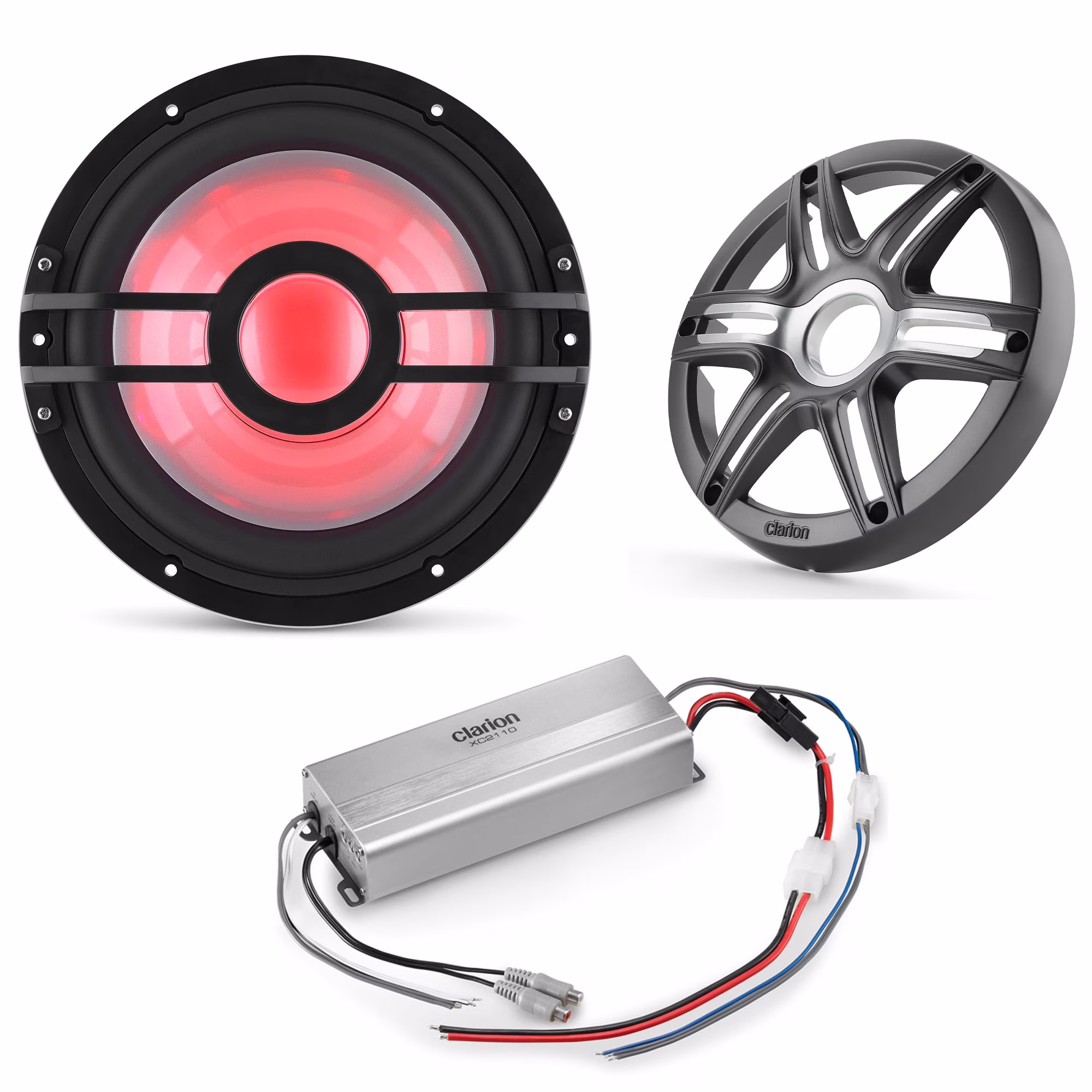 Clarion Marine Bass Bundle - CMSP-101RGB-2 10" RGB LED subwoofer includes Gunmetal Grill, Clarion Marine XC2110 Amplifier