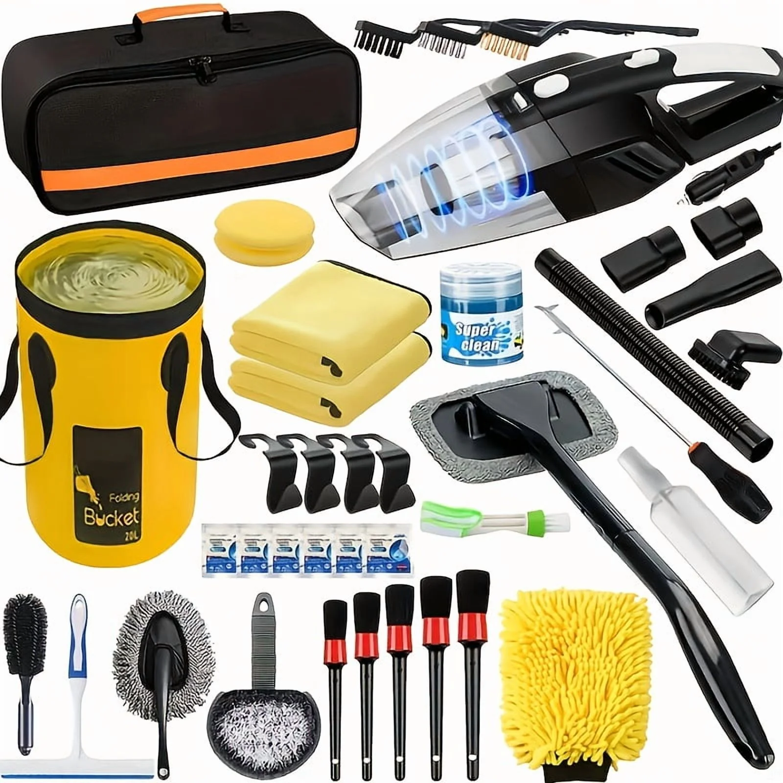 19pcs/41pcs Car Cleaning Wash Kit Interior Detailing Cleaner Kit with High Power Handheld Vacuum, Collapsible Bucket, Windshield Tool, Gel, Snow Shovel, Tire Brush, Complete Car Care Tools, Black