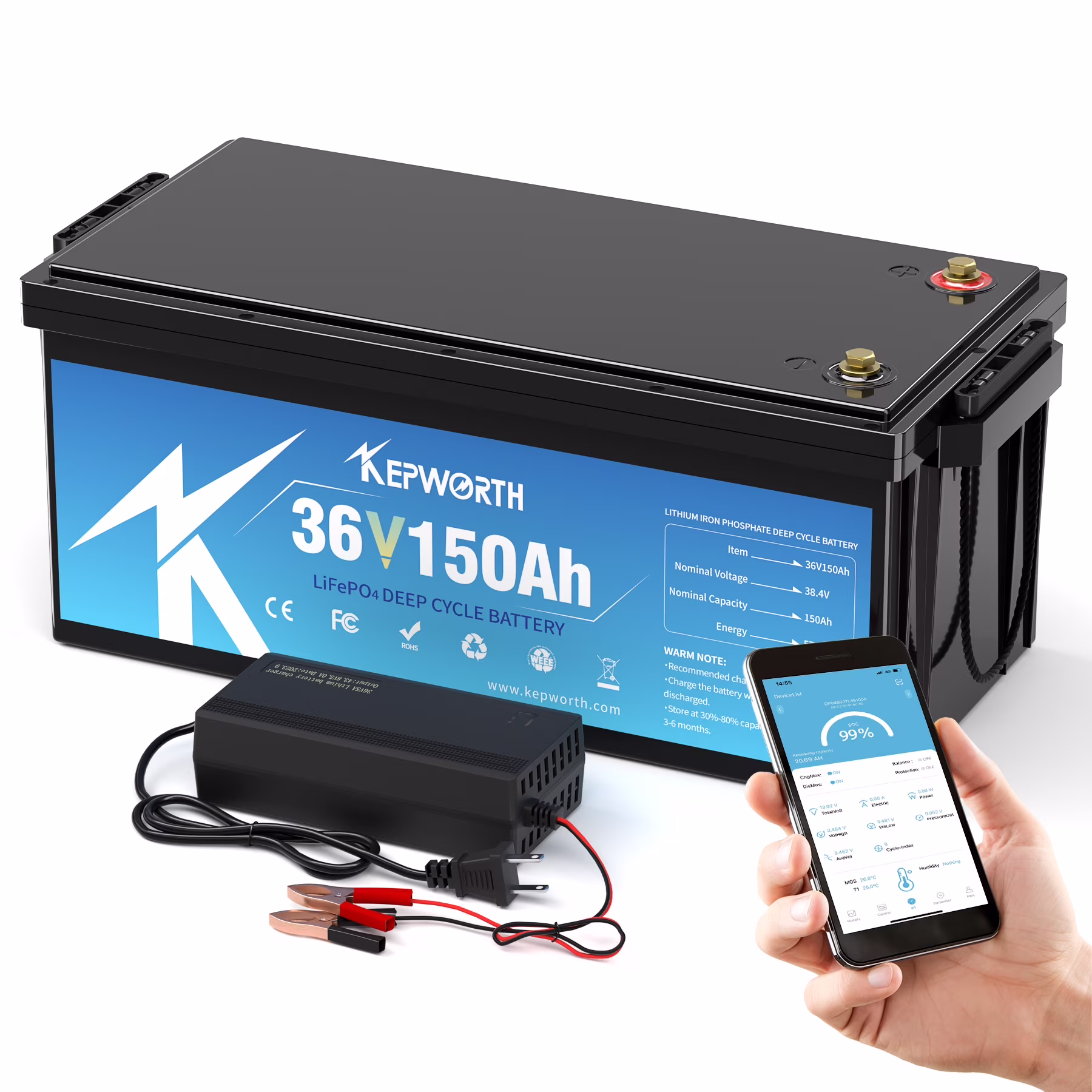 KEPWORTH 36V 150Ah LiFePO4 Battery, Lithium Batteries with 200A BMS, Rechargeable Deep Cycle, Perfect for Trolling Motor, Golf Cart, Marine, Camper, RV, Solar Power, Off Grid
