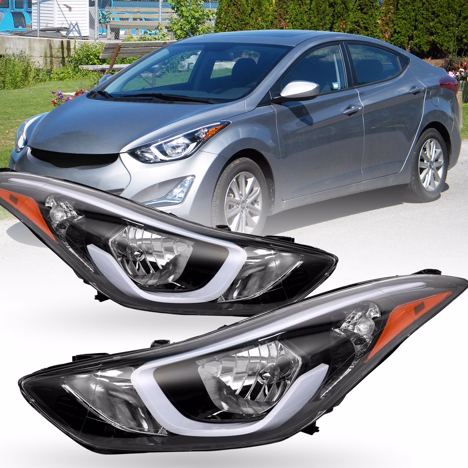 Pair of Headlights, Fits 2014 2015 2016 Hyundai Elantra Sedan Left and Right Headlights, LED Black Housing Amber Corner Clear Lens Halogen Headlights Direct Replacement (Driver + Passenger Side)