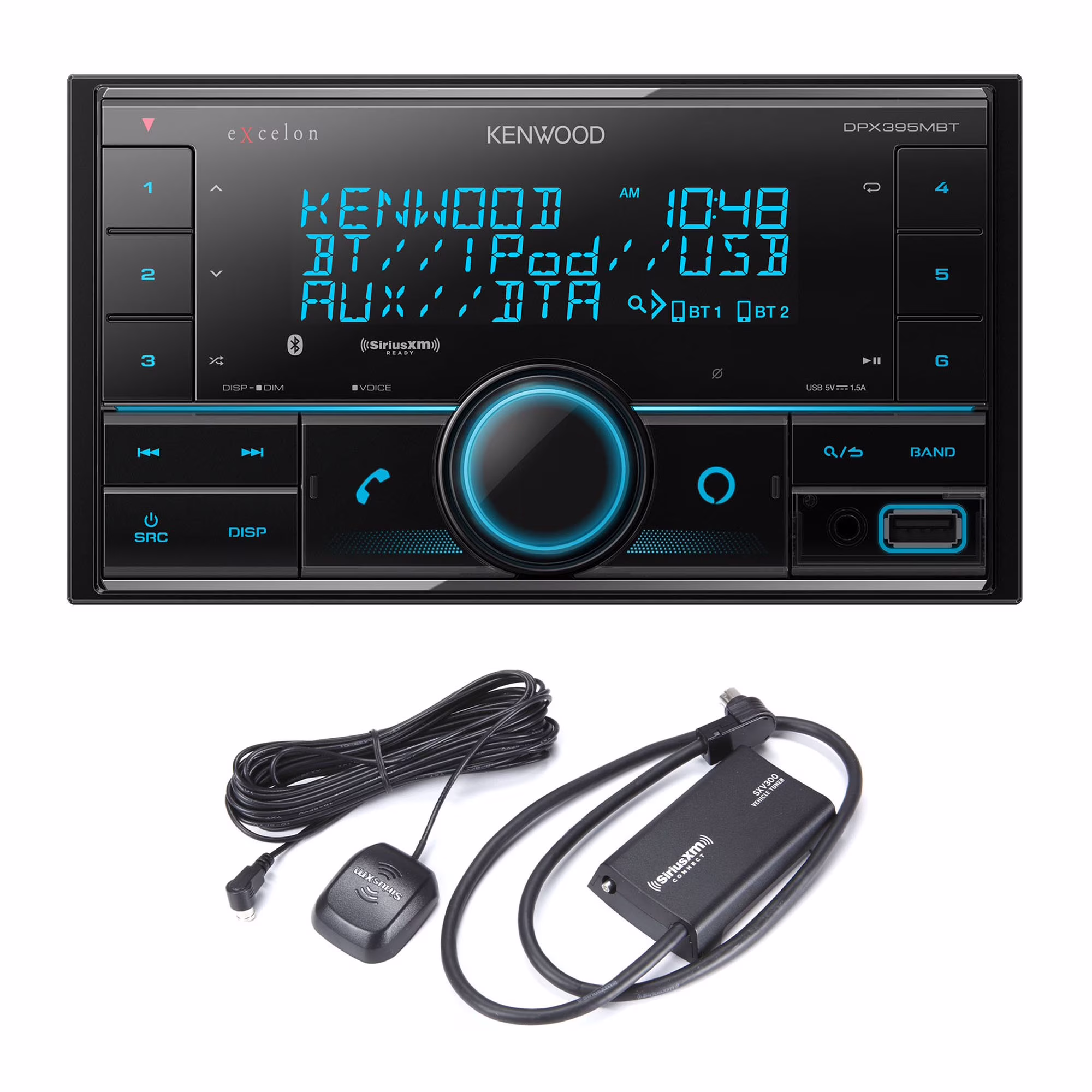 Kenwood DPX395MBT Bluetooth AUX and USB Double DIN CD receiver with a Sirius XM SXV300v1 Connect Vehicle Tuner Kit for Satellite Radio