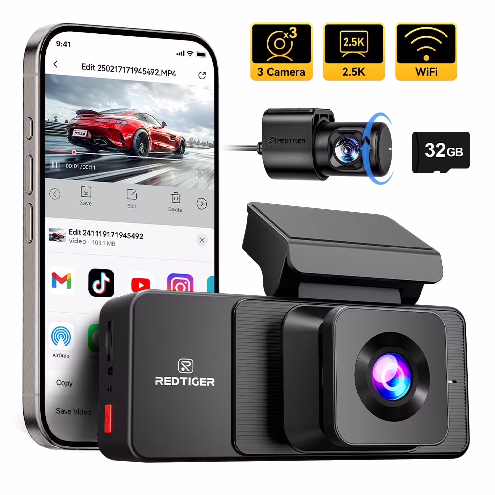 REDTIGER 3 Channel Dash Cam, 2.5K+1080P+1080P Front Inside and Rear Dash Camera, Free 32GB Card, Car Camera for Cars, Wifi, WDR Night Vision, 24H Parking Mode