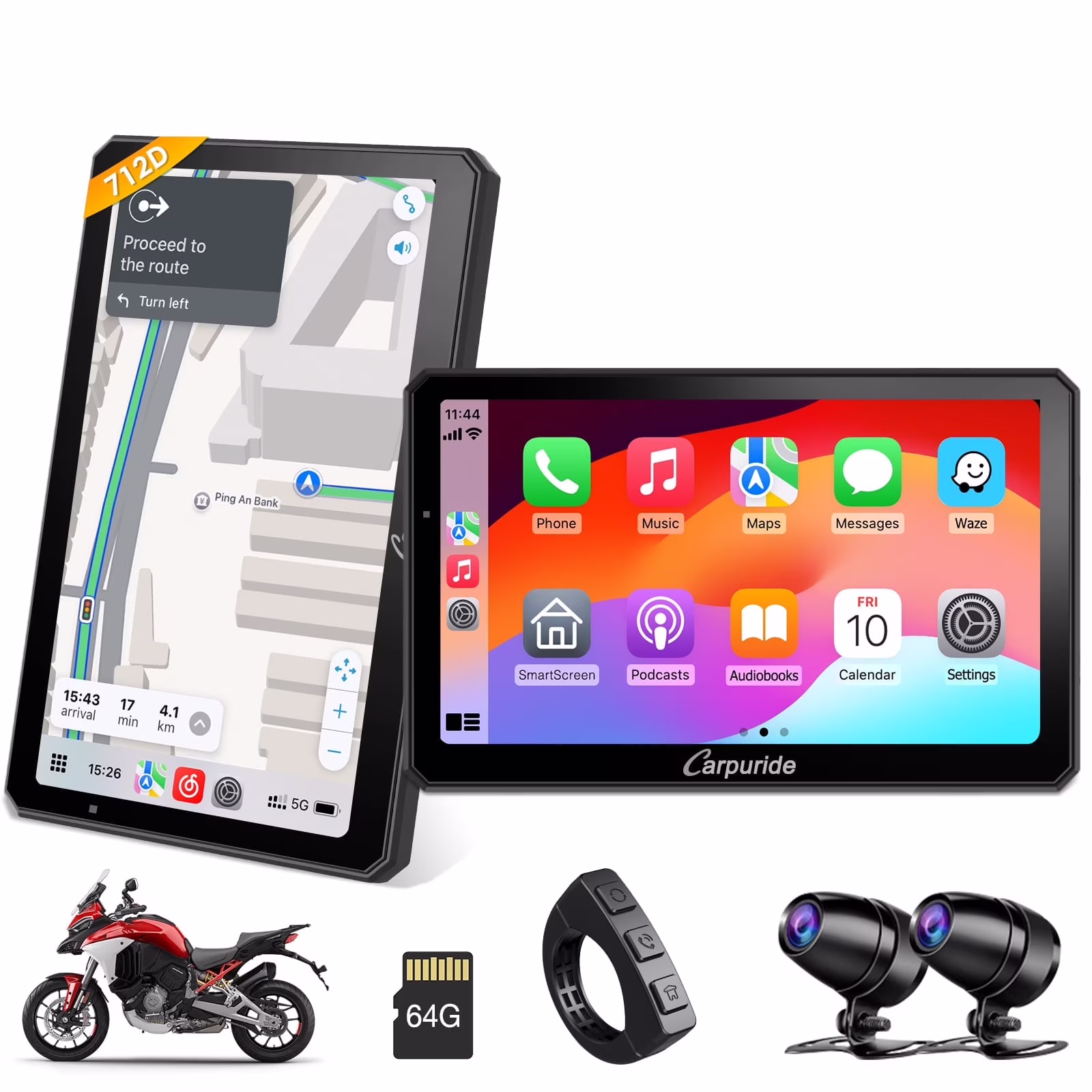 Carpuride Motorcycle HD Dual 1080P Dash Cam, Wireless Apple CarPlay & Android Auto Wire Control, Horizontal Vertical Rotation 7" Touch Screen (712D)