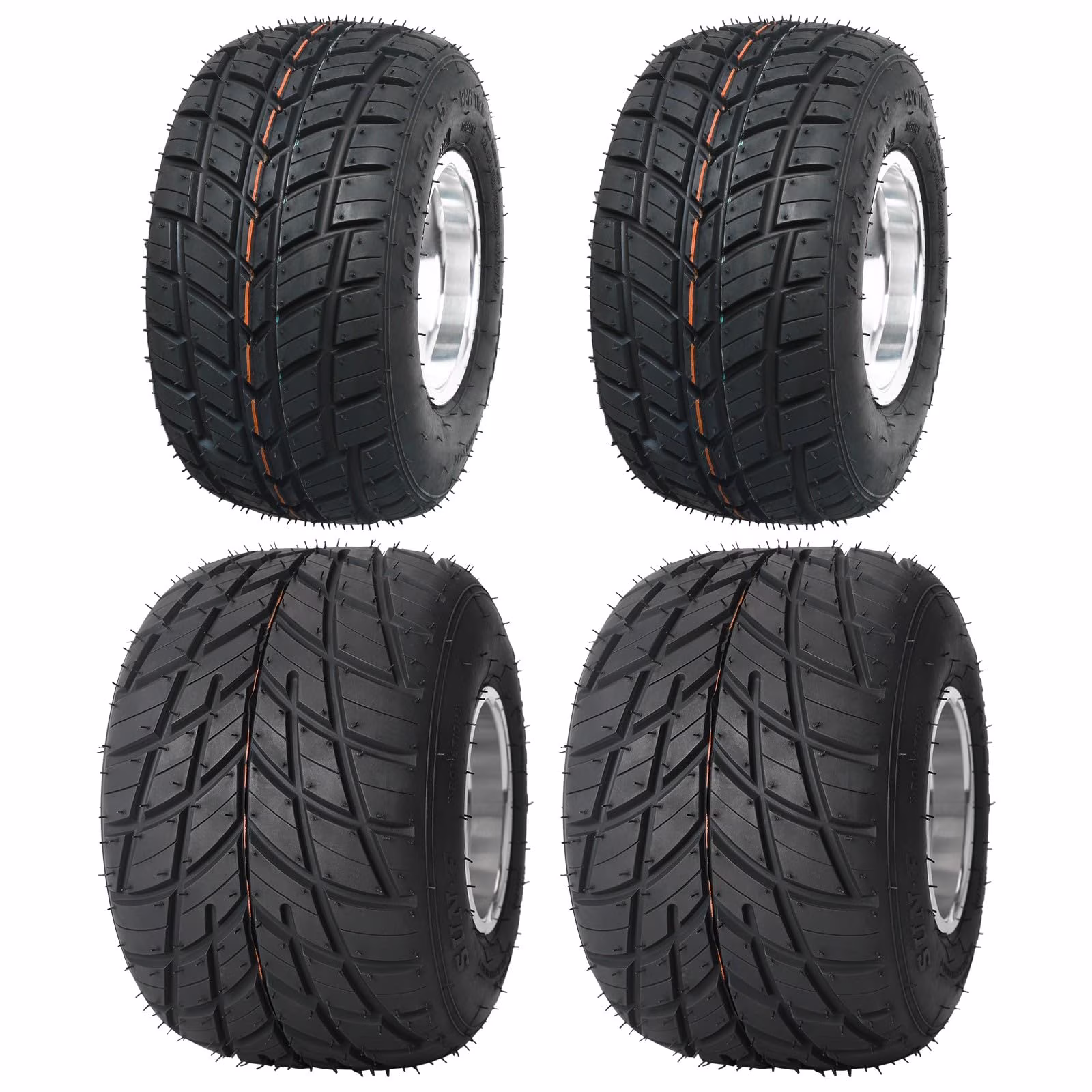 Set 4 Go Kart Tires and Rims, 10x4.50-5 Front Tubeless Tires Rims, 11x7.10-5 Rear Tires Rims, Go Cart Wheels and Tires Fit Bolt Pattern 58 mm with 3 Holes Drift Trike, Buggy Lawn Mower