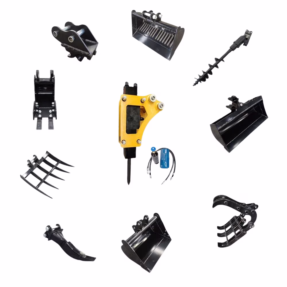 TYPHON 10-in-1 Mini Excavator Attachment Bundle – Quick Coupler, Buckets, Rake, Ripper, Auger, Grapple, Tilt Bucket & Hydraulic Hammer – Fits 0.6–2 Ton Excavators, Heavy-Duty Tools Kit