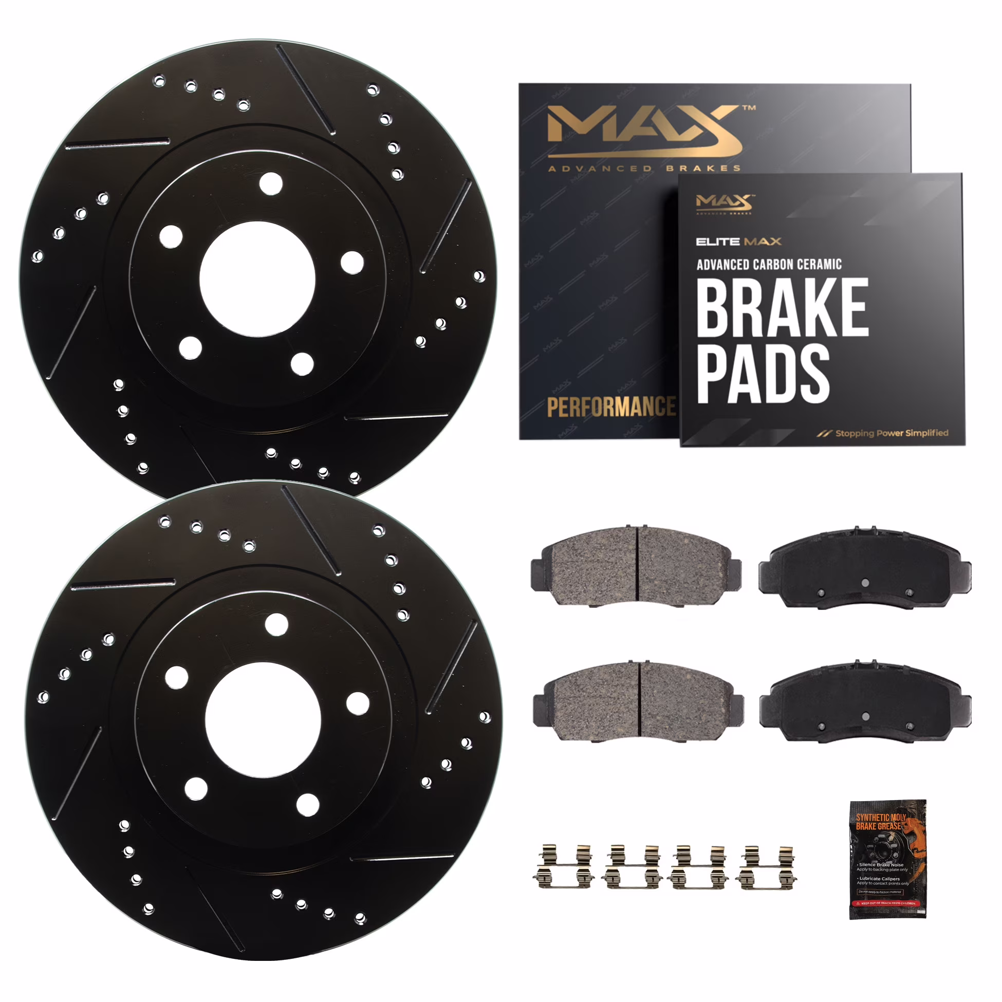 Max Advanced Brakes - Brake Kit for 2002 2003 Lexus ES300 2005-2007 Toyota Avalon Camry 2004-2010 Sienna Solara Front Replacement Drilled Slotted Black Coated Disc Brake Rotors and Ceramic Brake Pads