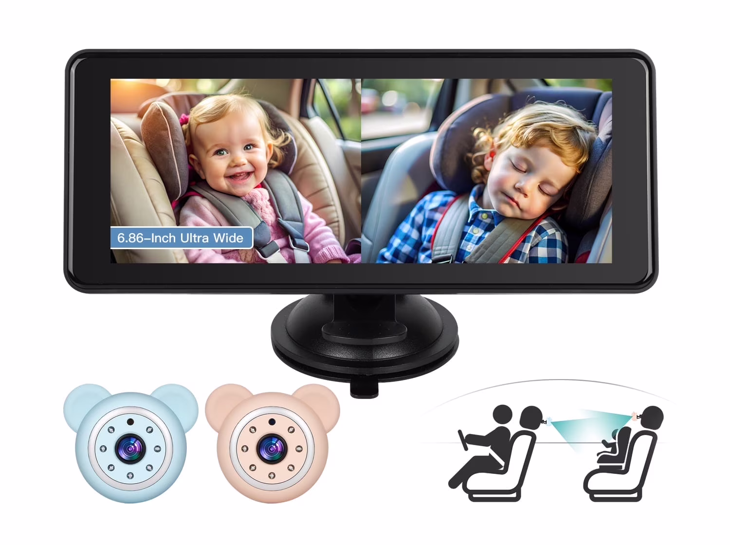 Baby Car Camera for 2 Kids - 6.9-Inch Monitor Easy Setup 360° Rotatable Double HD 1080P Clear Night Vision Car Seat Camera Rear Facing for Twins or Siblings, Safety & Convenience