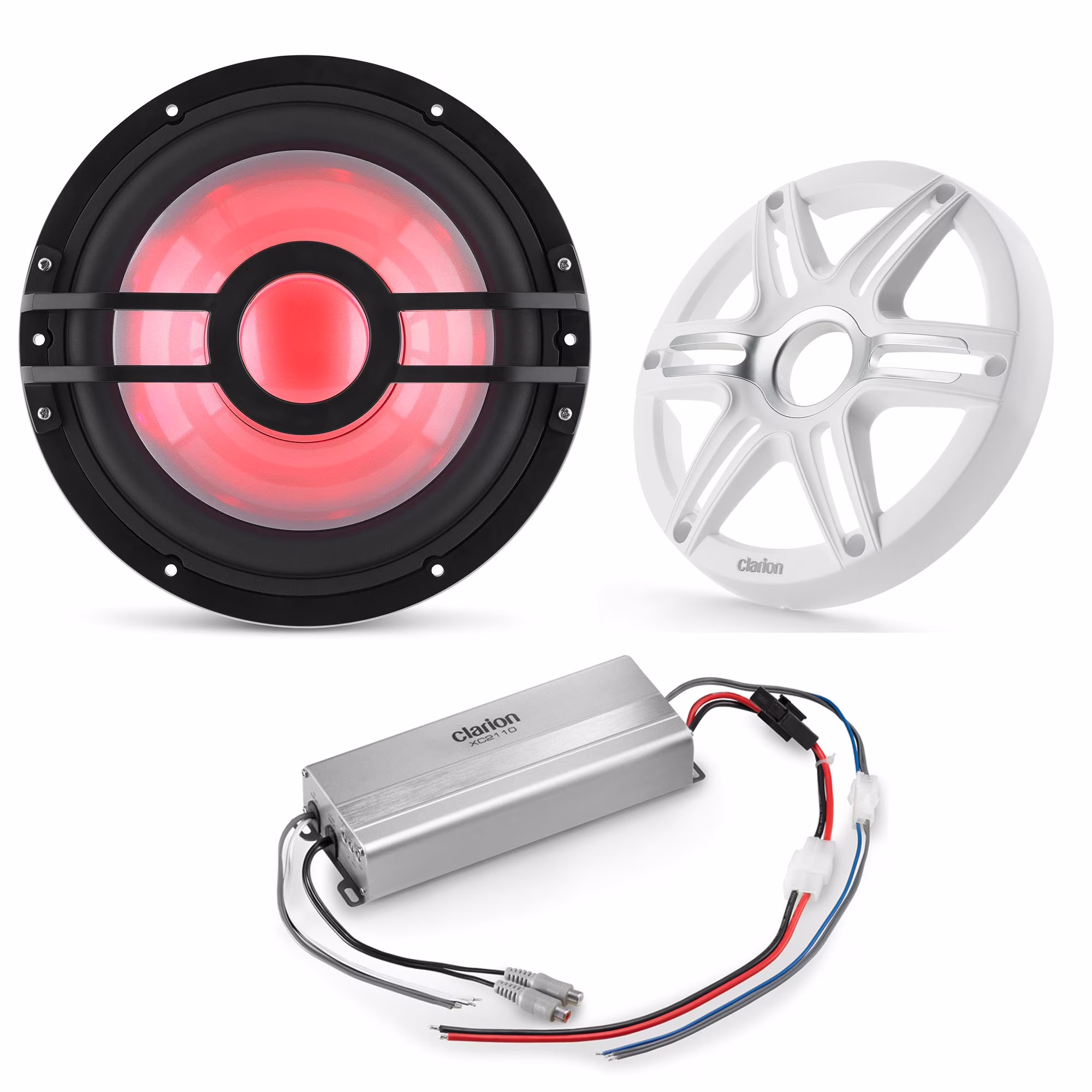 Clarion Marine Bass Bundle - CMSP-101RGB-2 10" RGB LED subwoofer includes White Grill, Clarion Marine XC2110 Amplifier