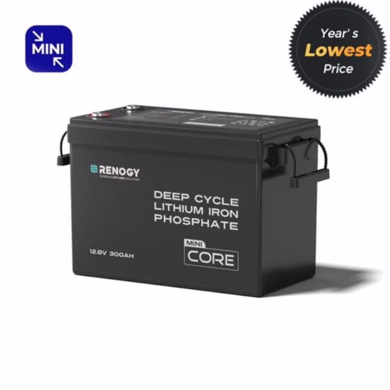 Renogy 12V 300Ah Mini Size LiFePO4 Lithium Battery, 200A BMS for Ultimate Safety, Deep Cycle w/Remote Monitoring Compatibility, Backup Power for RVs, Cabins, Marine, home storage - Core Series