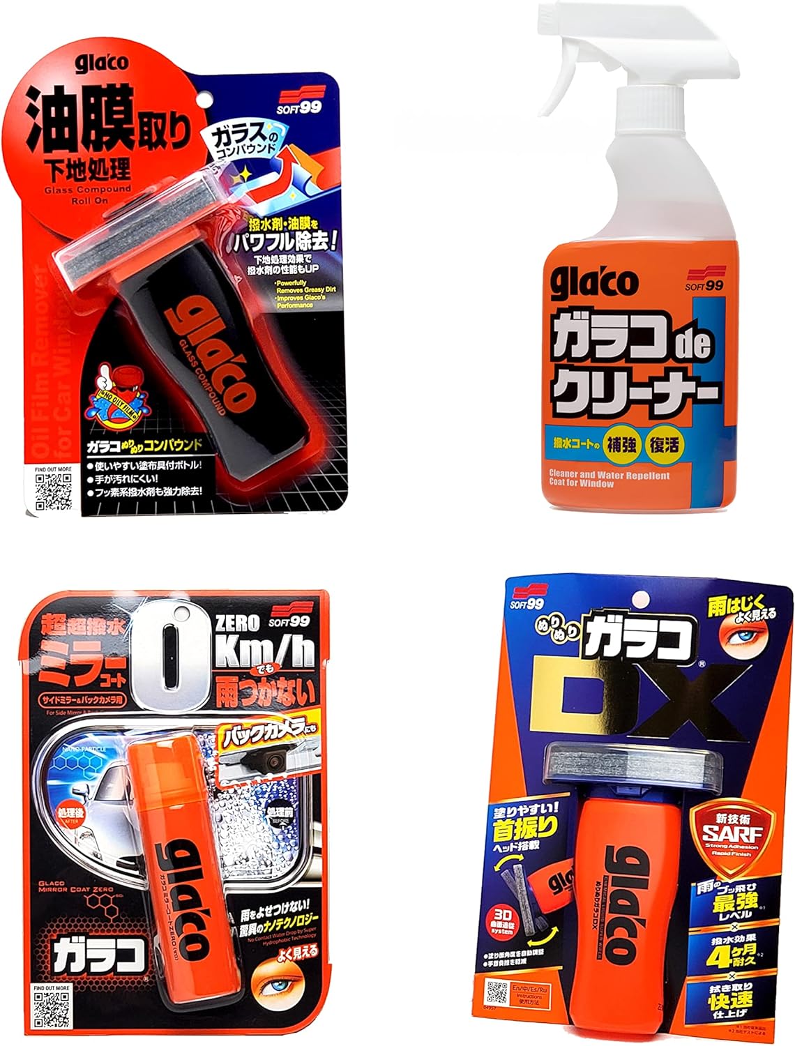 Glaco Glass Compound Roll On 100ml, Glaco Mirror Coat Zero 40ml, Glaco DX_110ml, and Glaco De Cleaner_400ml_Bundle Package
