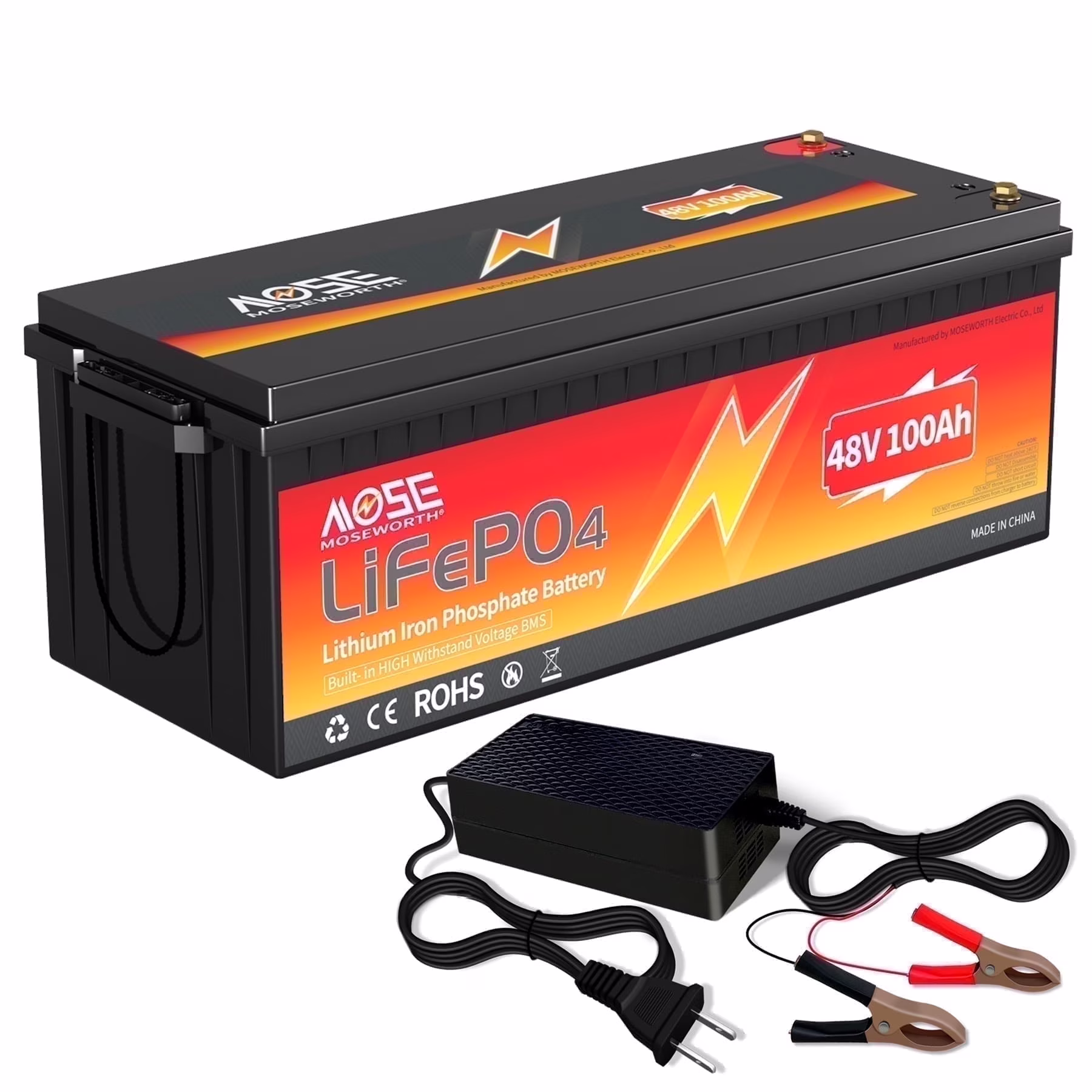 48V 100Ah Golf Carts LiFePO4 Battery,200A BMS,MOSEWORTH Lithium Batteries with Charger,for RV,Solar,Trolling Motor,Marine,15000+Deep Cycles,2C Rate Discharging