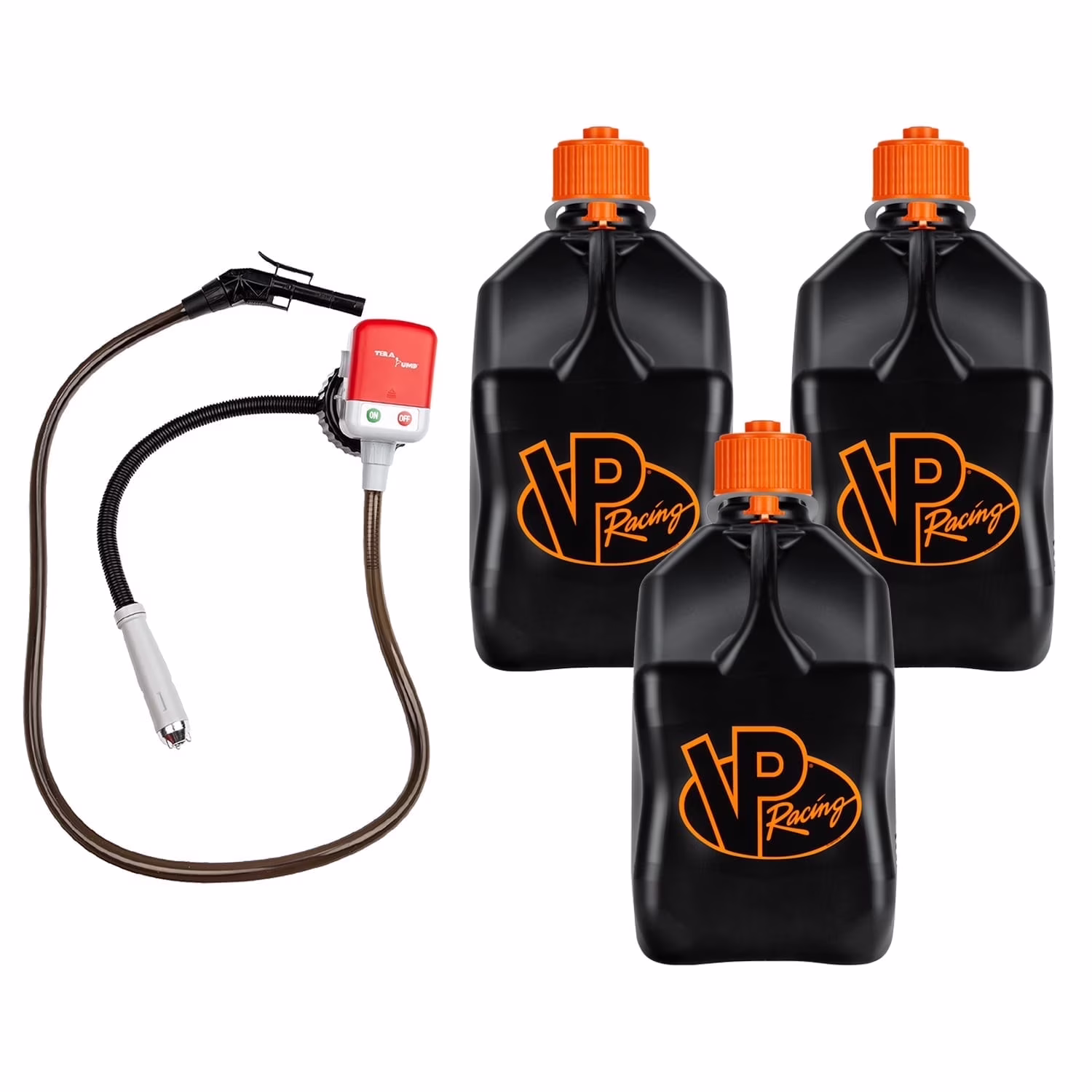 VP Racing 3852-CA, 5.5-Gallon Square Motorsport Jug V-Twin (3 Pack), w/Utility Jug Battery Powered Fuel Transfer Pump (1 Pack)