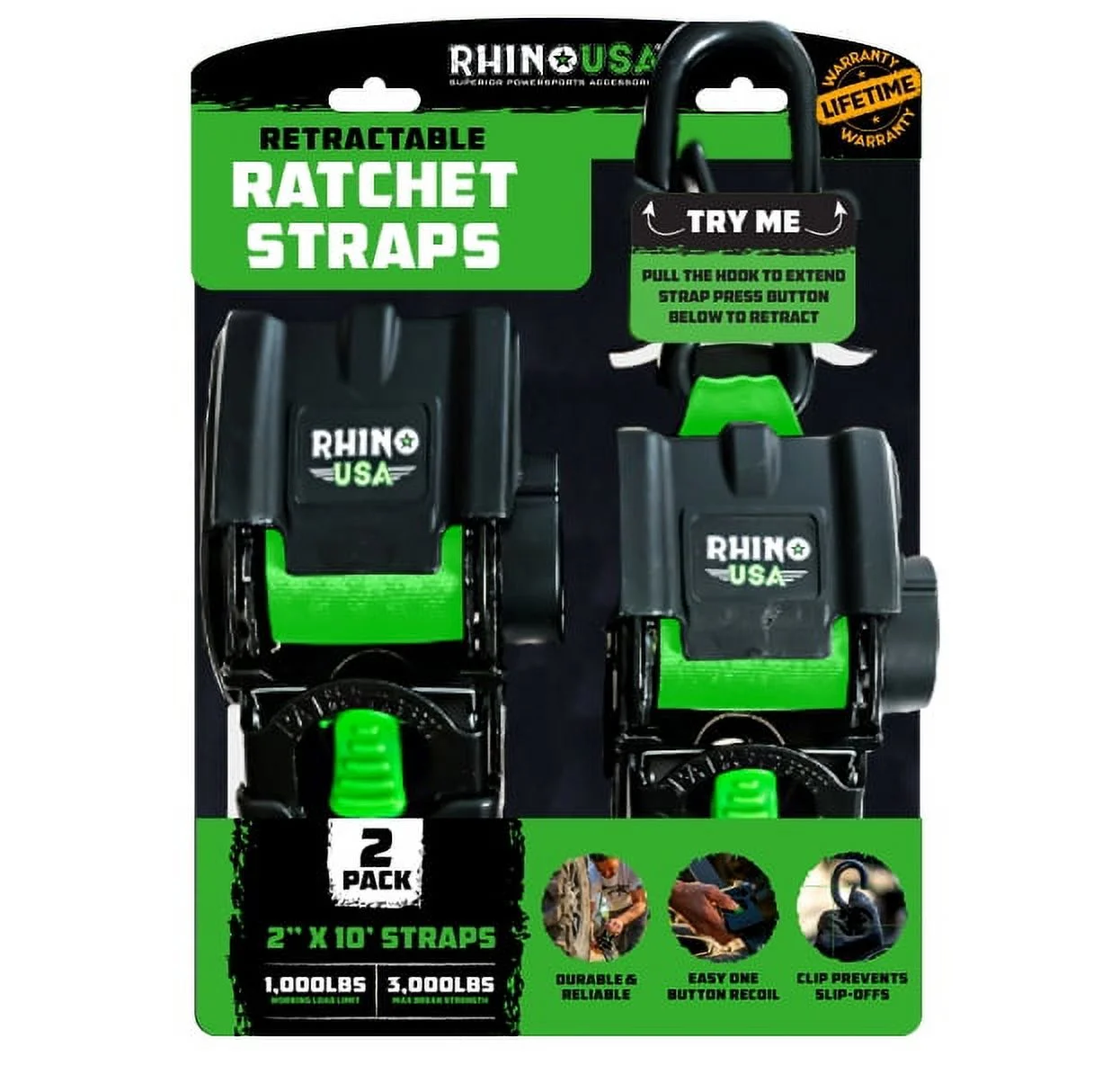 Rhino USA 2in x 10ft Retractable Ratchet Straps, 2 Pack, 1,000lbs Working Load Limit, 7.3lb Product Weight
