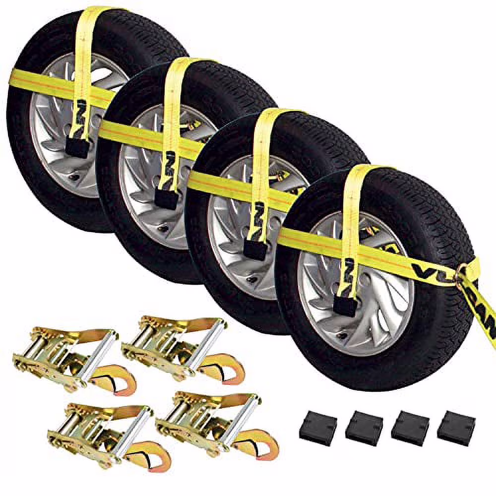 VULCAN Car Tie Down Kit - Adjustable Loop - Snap Hooks - Classic Yellow - 4 Straps and 4 Ratchets