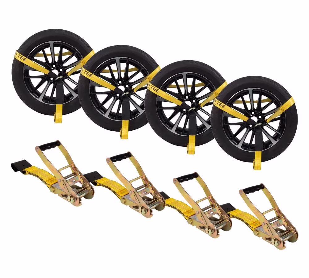 (4 Pack) 2" x 120" Car Tie Down Straps for Trailer with Flat Hook - 3333 LB WLL Lasso Style Tire Straps for Car Trailer with Ratchets - Vehicle Tie Down Wheel Straps for Hauling Cars