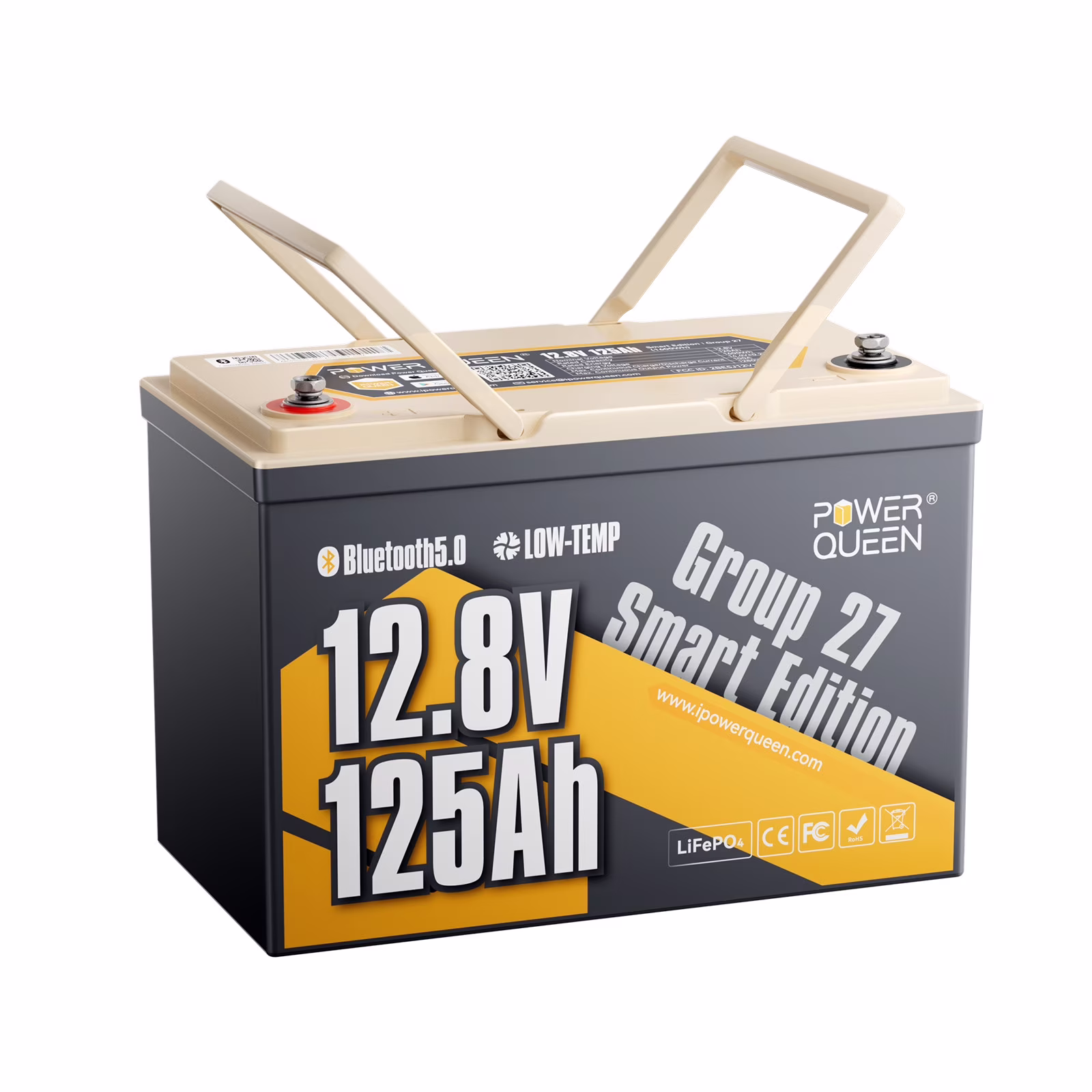 Power Queen 12V 125Ah Lithium Battery Group 27 Bluetooth LiFePO4 Battery,1600Wh Energy, 100A BMS with Low-Temp Protection for RV, Marine, Home Energy Storage