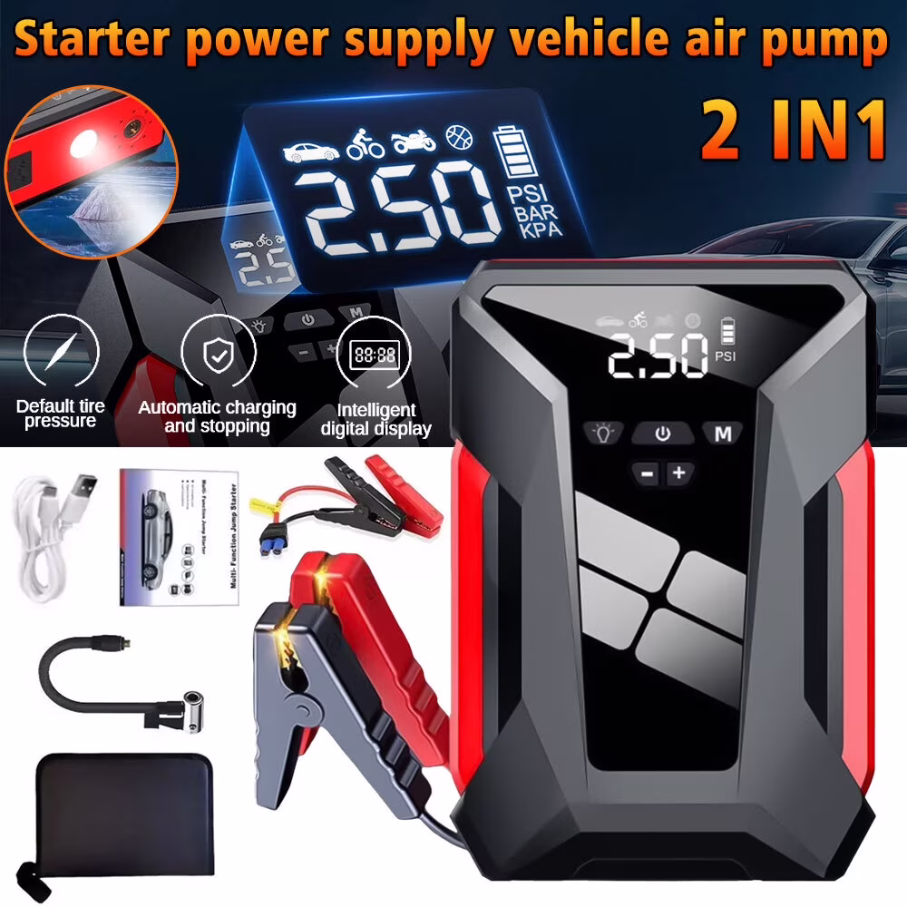 Jump Starter with Air Compressor, 1000A Peak Battery Charger, 150PSI Digital Tire Inflator, 12V Jump Box with Emergency LED Light and Power Bank, Includes Storage Bag