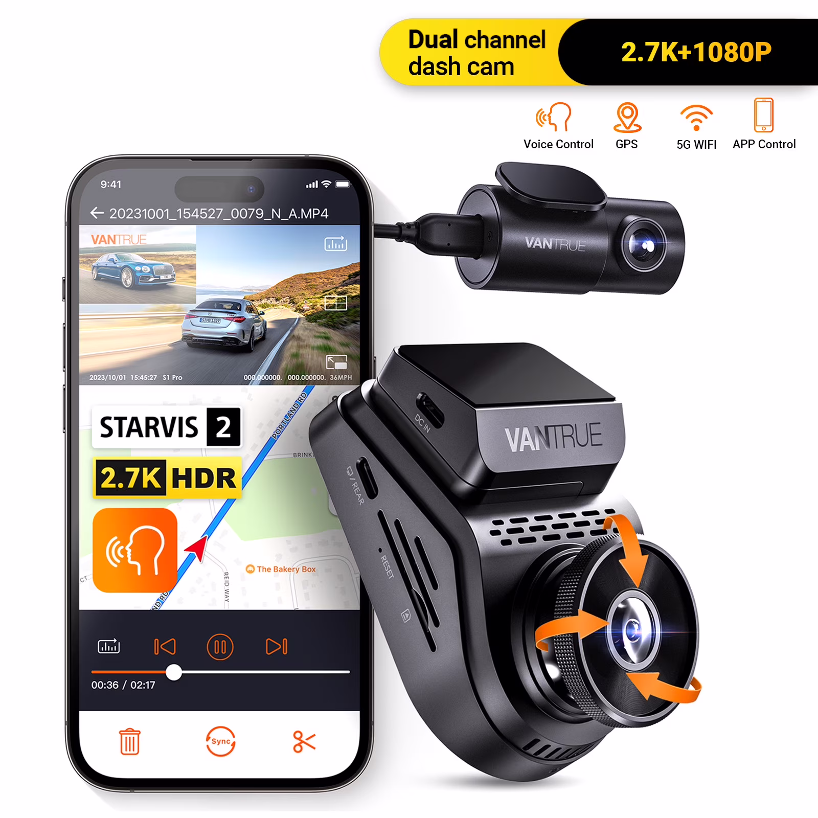 Vantrue S1 PRO 2.7K Dual Dash Cam, STARVIS 2 HDR, 1440P 60FPS, GPS, Voice Control, 24/7 Parking, 512GB Max