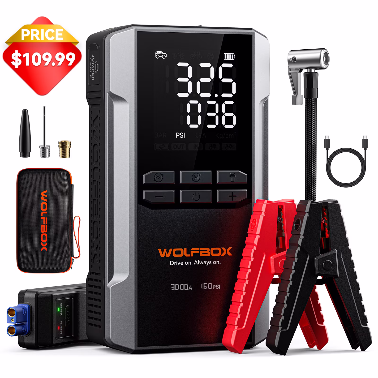 WOLFBOX 3000A Car Battery Jump Starter with 160PSI Air Compressor, 16000mAh Jumper Box pack Portable(for 8L Gasoline 6L Diesel Engines), Digital Tire Inflator