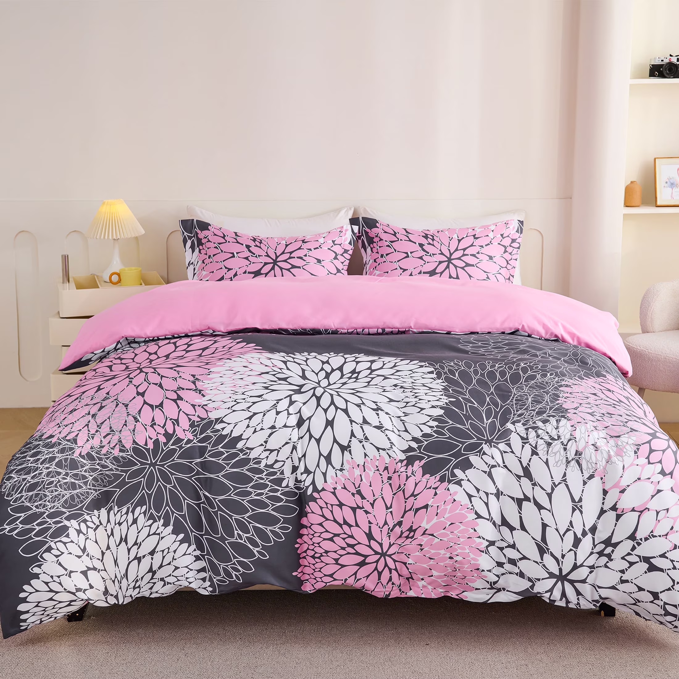 Koniroom 3 Pieces Pink and Grey Duvet Cover Queen Size, Reversible Floral Duvet Cover Queen With Cute Flowers for Women Teen Girls
