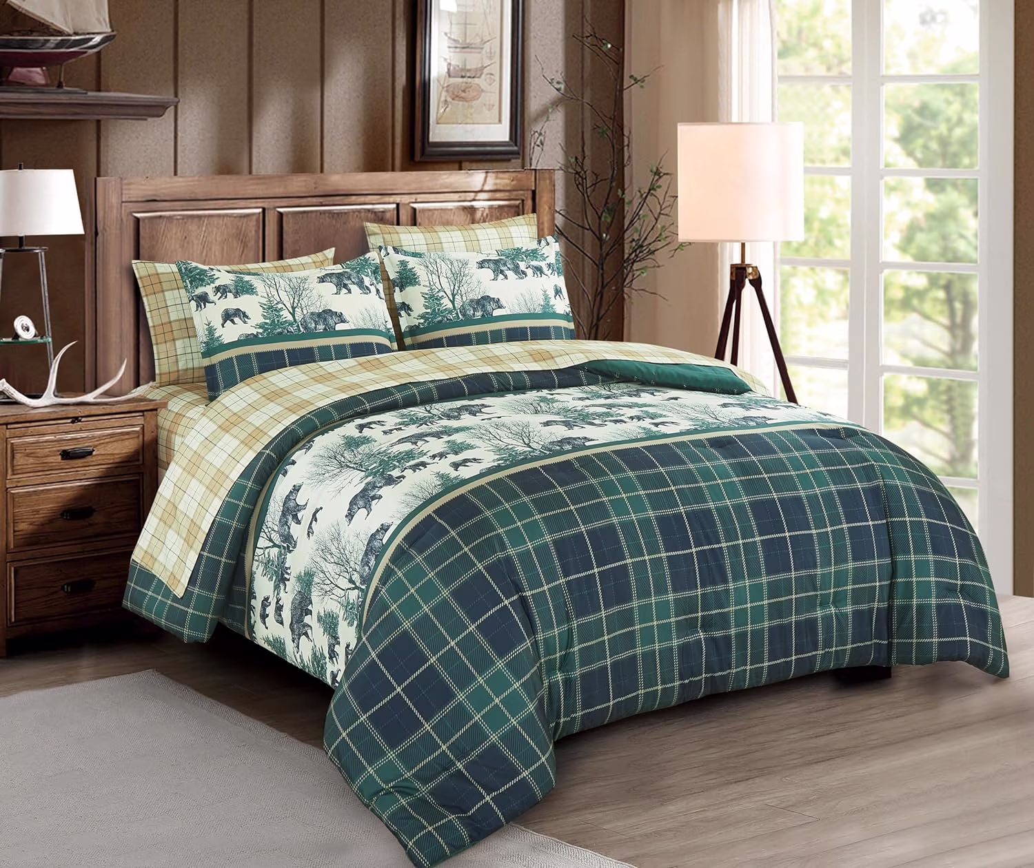 Chezmoi Collection Alpine 7-Piece Northwest Cabin Lodge Bed in a Bag Queen Comforter Set, Blue Green Ivory Tan Grizzly Bear Pine Tree Wilderness Printed Microfiber Bedding Set