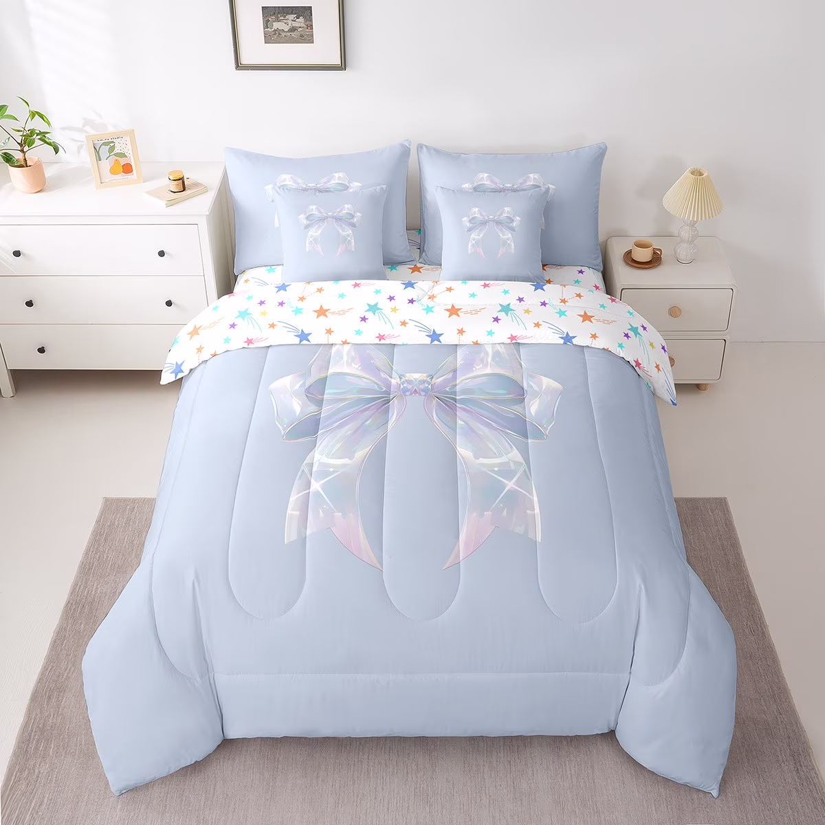 Erosebridal Bowknot Bed in a Bag Twin size for Teens, Princess Ribbon Bed Set, Bling Bow Decor, Reversible 7pcs