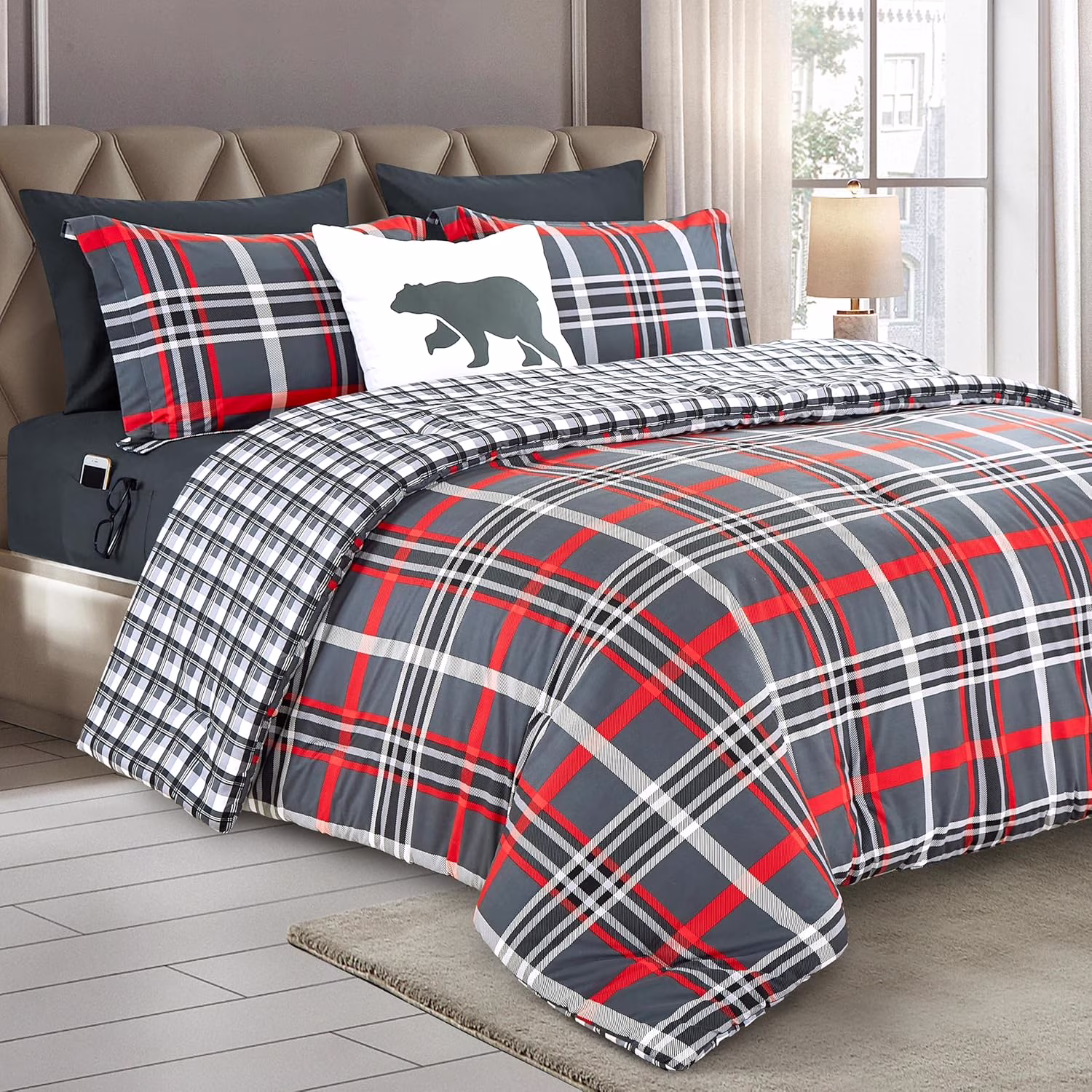Mocassi 8-Piece Lodge Plaid Reversible Comforter Set, All-Season Bed in a Bag - Includes Sheet Set with Smart Pockets, Matching Shams & Decorative Pillow, Full/Queen, Burgundy