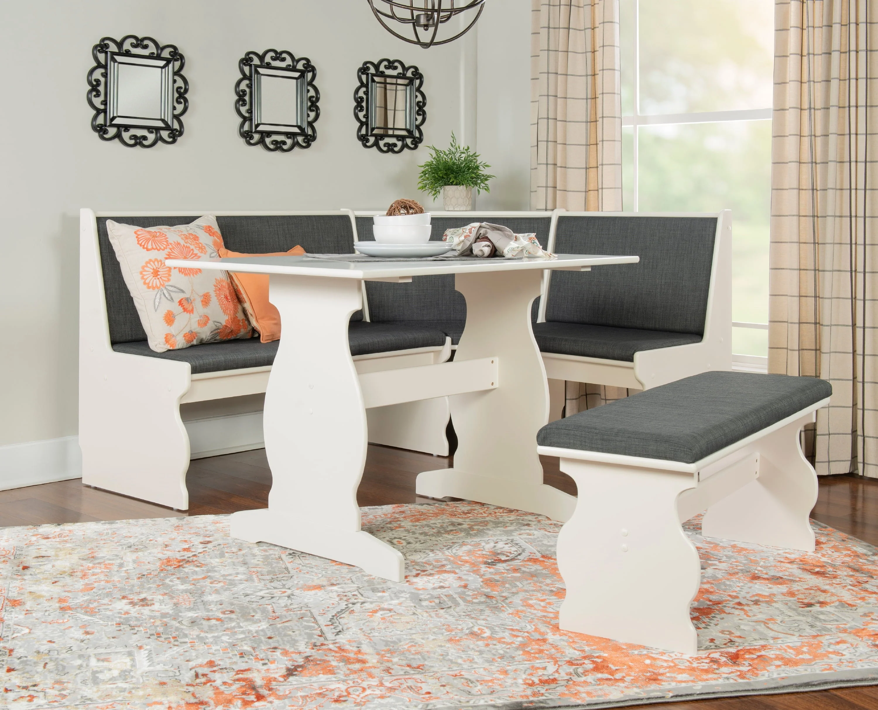 Linon Weston Corner Dining Breakfast Nook with Table and Bench, Seats 5-6, White Finish with Charcoal Fabric