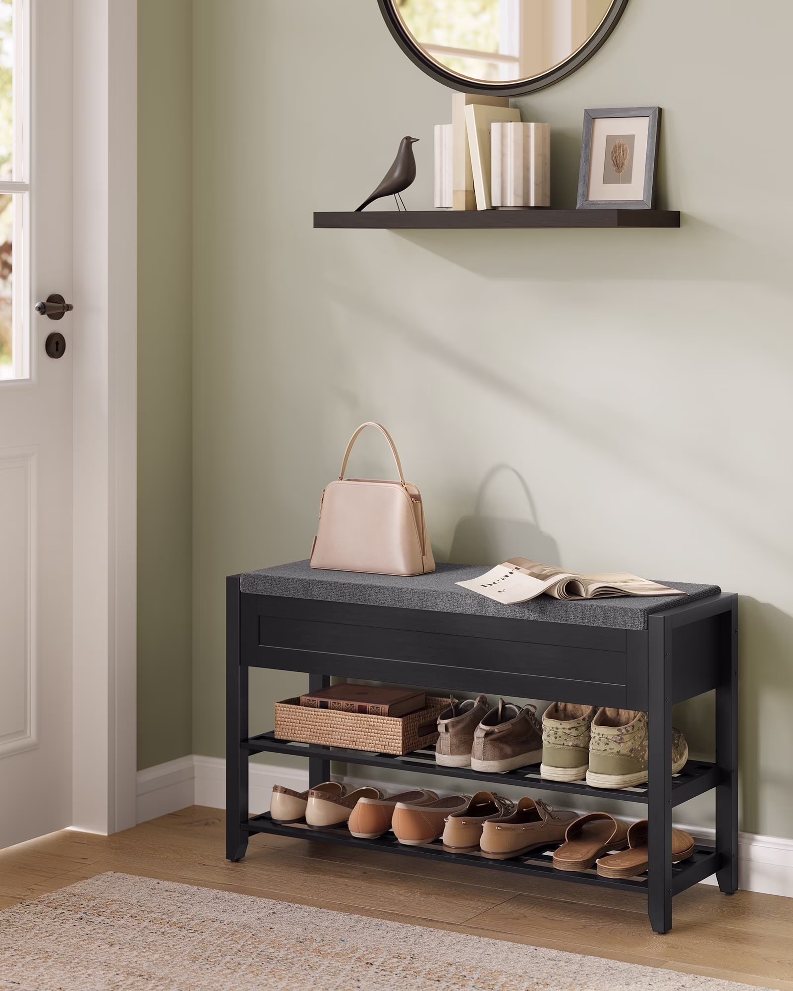 2-Tier Bamboo Shoe Bench with Hidden Storage, 31.5 Inch Entryway Organizer, Multi-Use Shelf for Shoes & D��cor, Ink Black