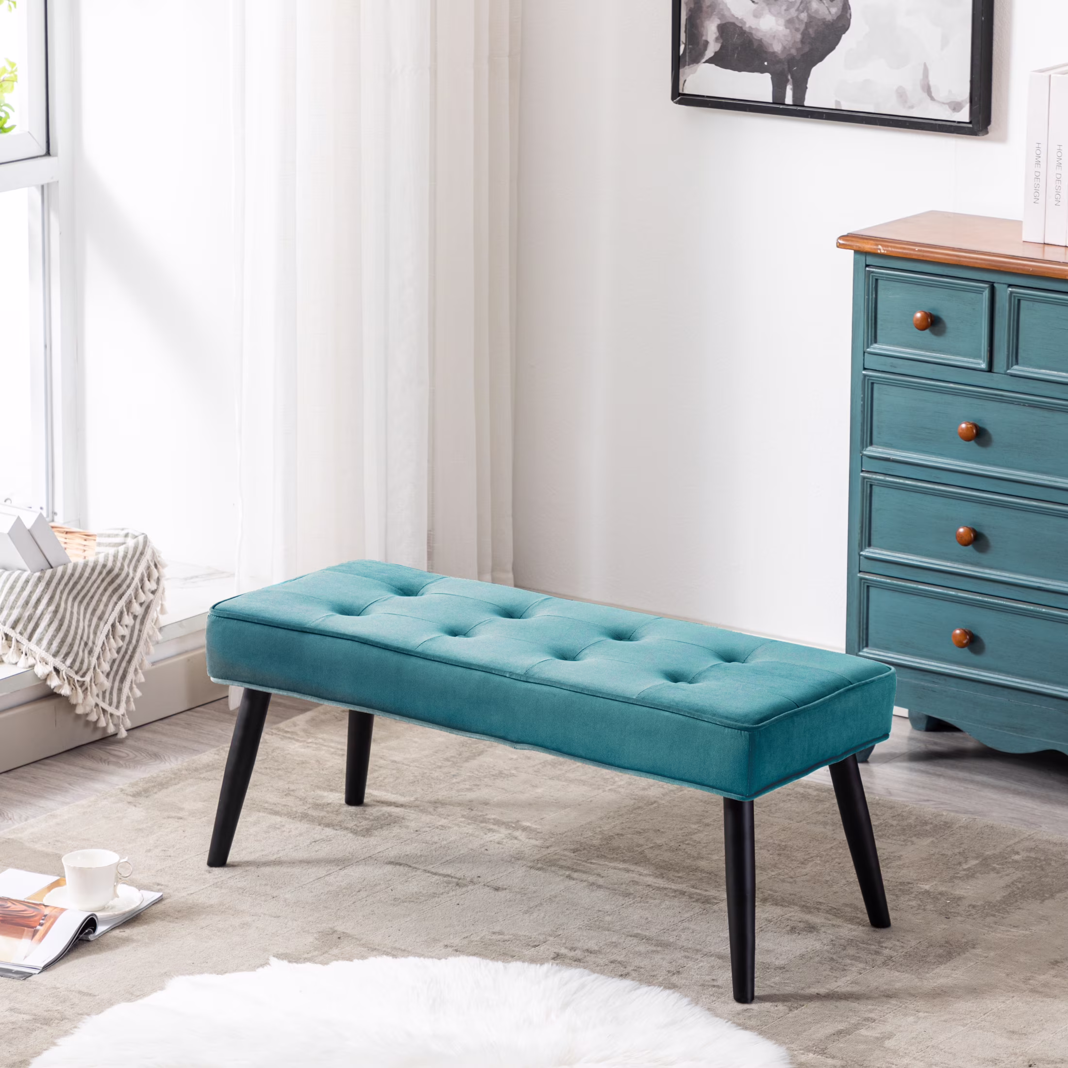 WestinTrends Velvet Tufted Bedroom Bench for Living Room & Entryway Furniture, Velvet Teal