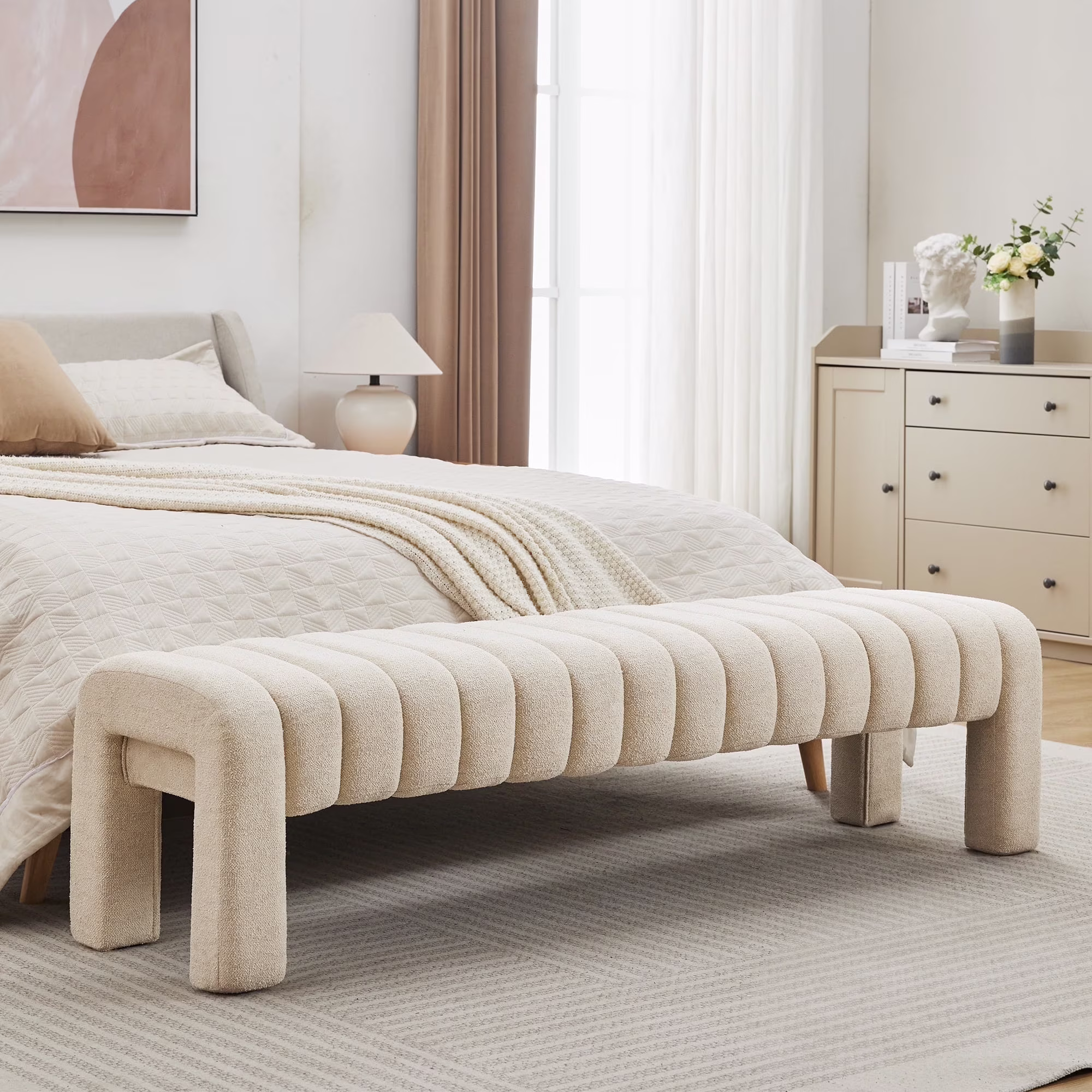 Zesthouse 63�� End of Bed Bench, Linen Tufted Upholstered Ottoman Bench with Padded Seat and Solid Wood Leg, Modern Entryway Bench for Bedroom, Living Room, Beige