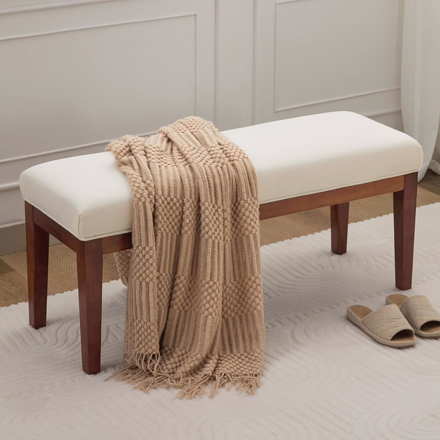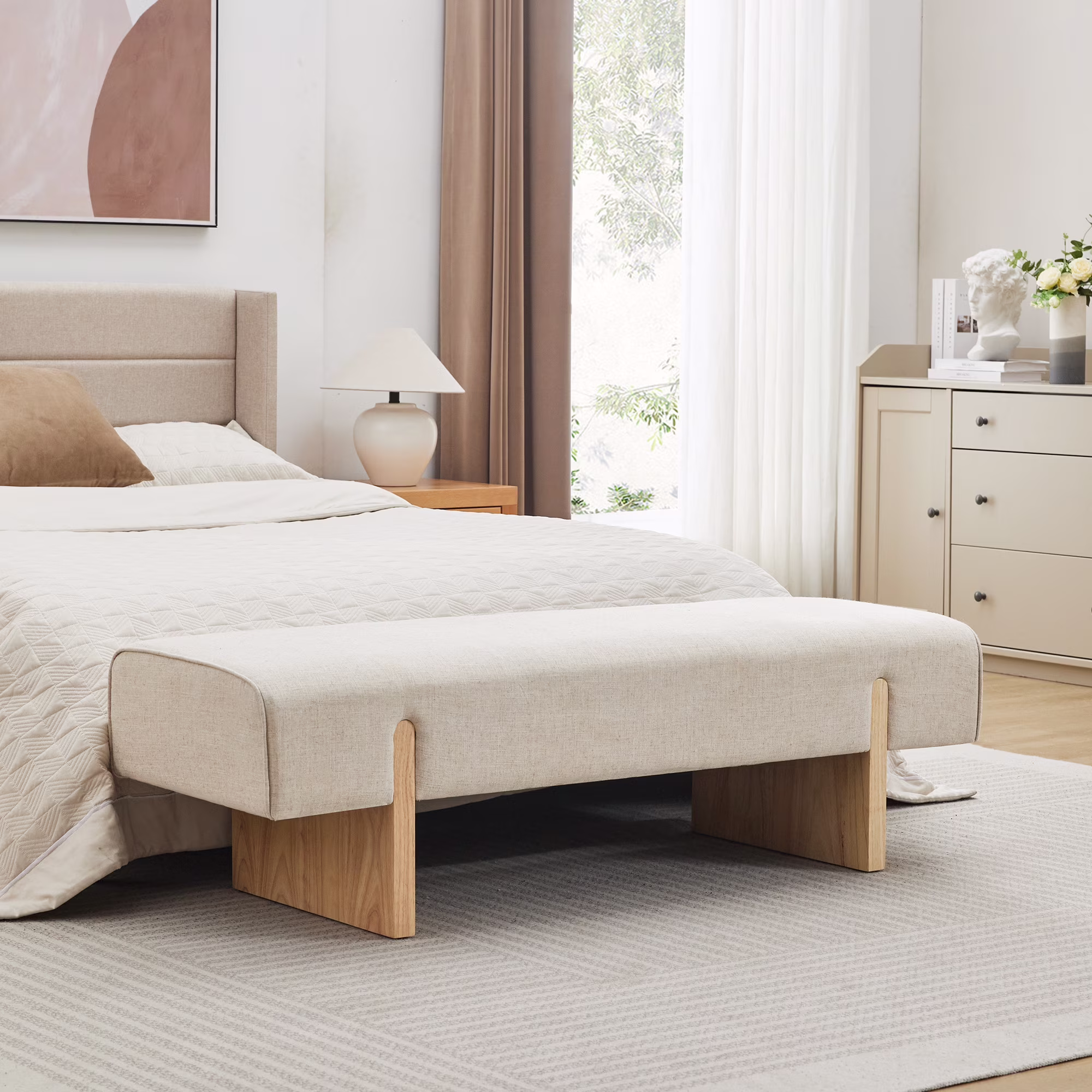 Zesthouse 55.1" Upholstered Bench, Modern Linen Ottoman Bench with Wooden Legs, Entryway Bench for Bedroom Living Room, Beige