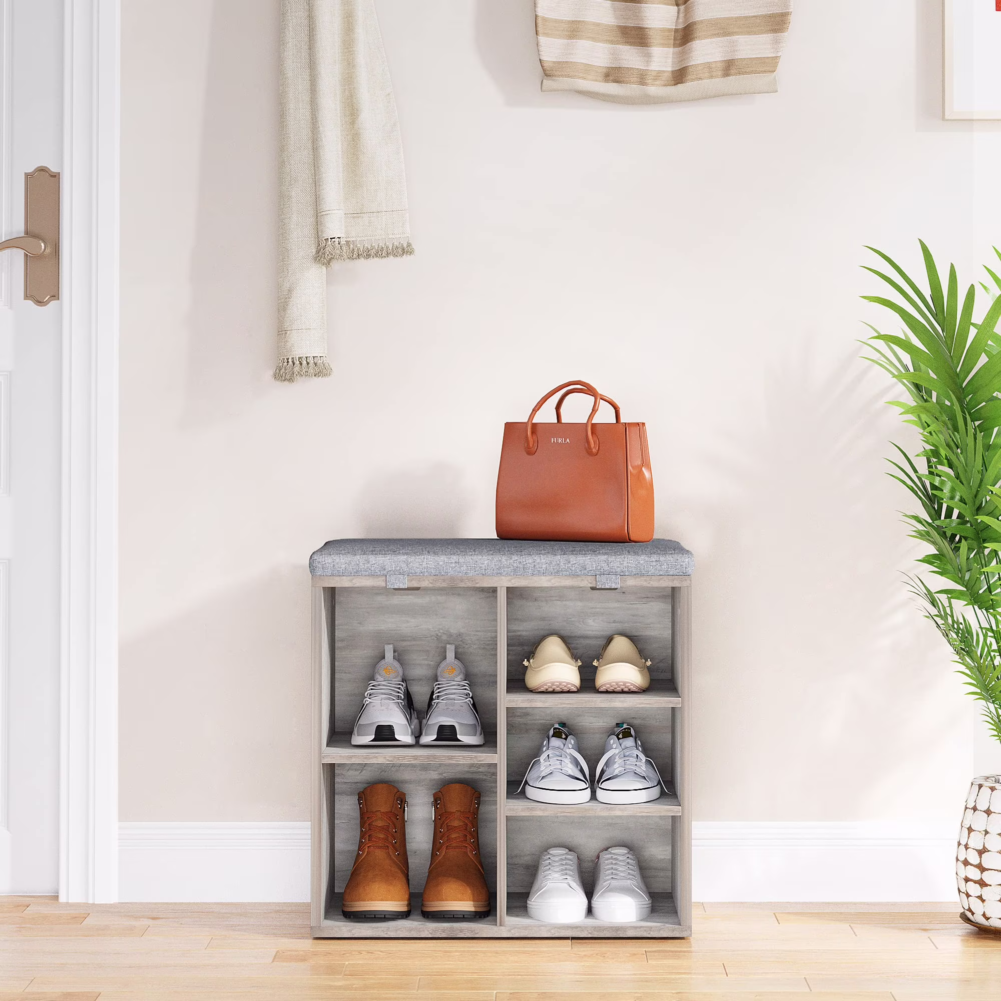 Shoe Bench with Adjustable Shelves��Entryway Storage Bench with Cushion��Wooden Shoe Storage Organizer for Hallway, Living Room, Mudroom, Bedroom, and Porch Decor