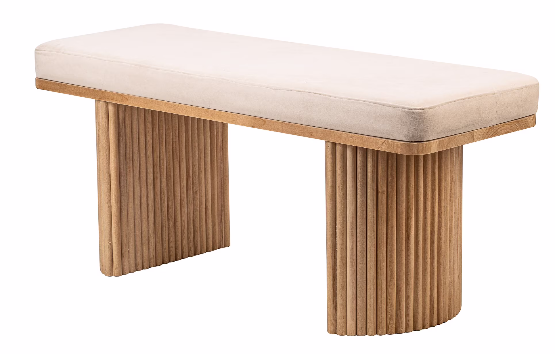 Solid Wood and Beige Velvet Bench Exotic Boho Entryway