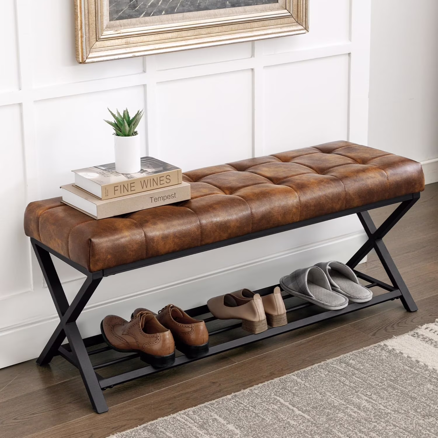 LUE BONA 44.5�� End of Bed with Shelf, Linen Tufted Upholstered Storage Shoe , Modern Bedroom with Metal Legs for Living Room, Entryway, Dining Room, 300 LB, Yellowish Brown