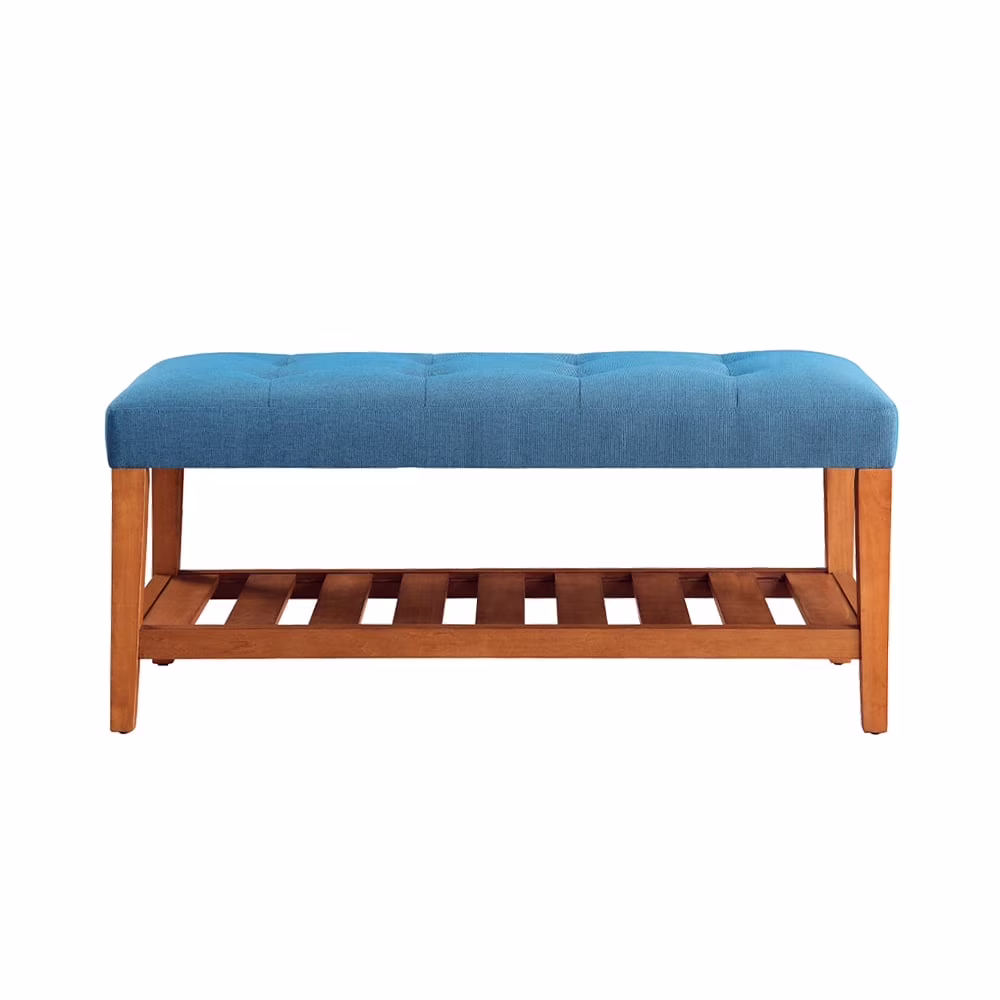 Xukmct Fabric Upholstered Bench with Open Storage Shelf, Perfect for Living Room, Bedroom, Blue + Brown