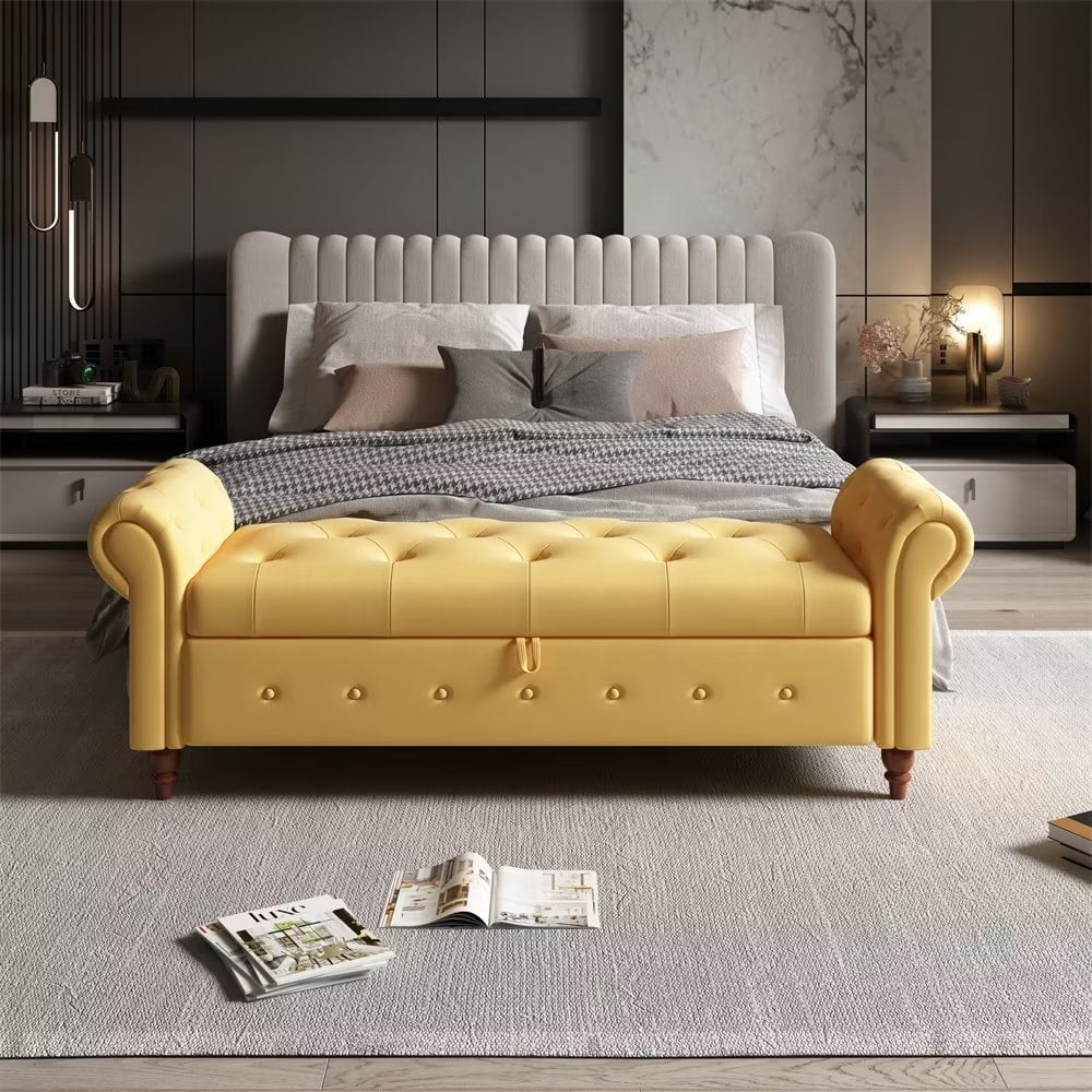 Storage Bench for Bedroom, 63inch End of Bed Bench with Arms, Modern Button Tufted Upholstered Ottoman Footrest for Entryway Living Room, Yellow