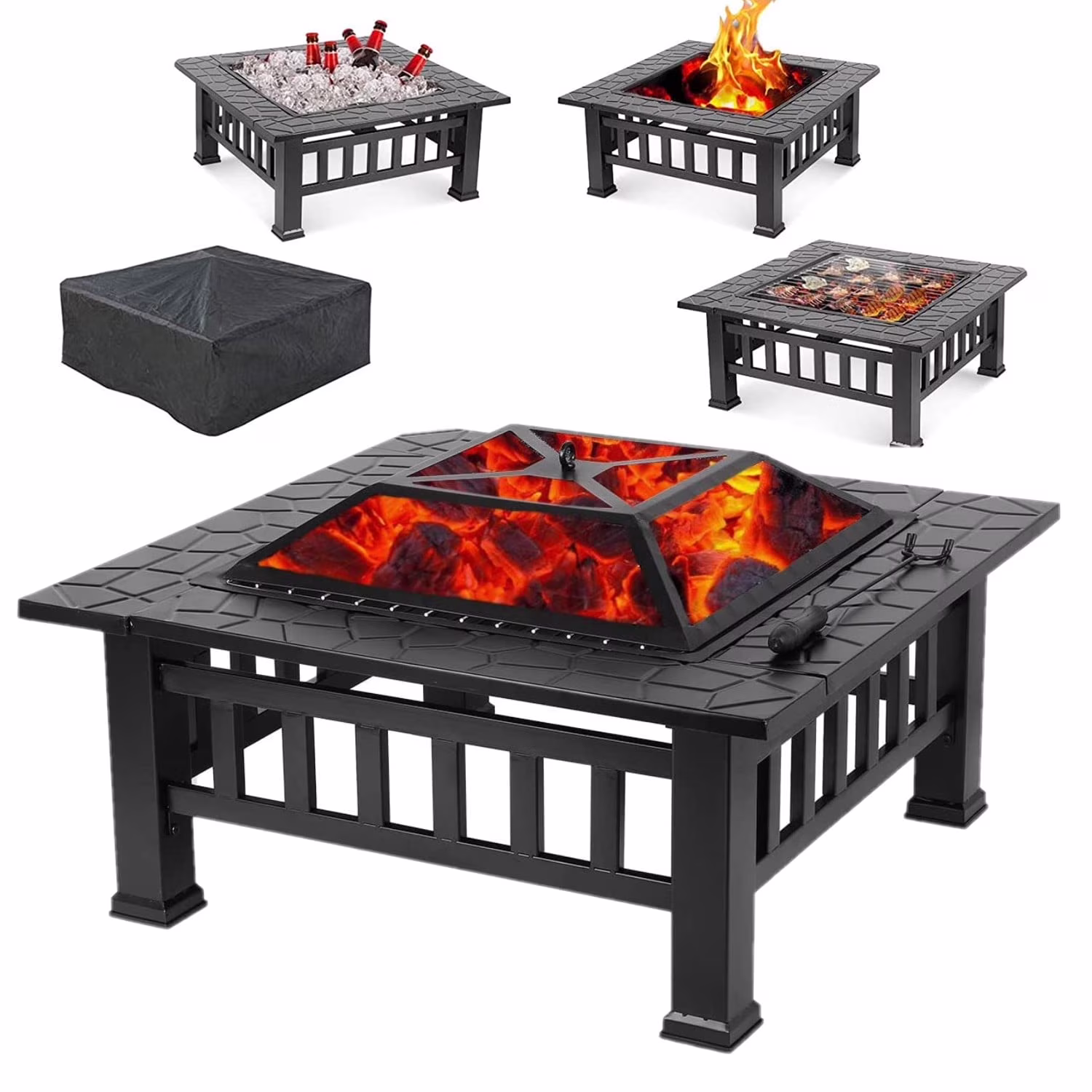 LAZY BUDDY Steel Fire Pits for Outside, 32'' Square Wood Burning Firepit Table with Mesh Lid, BBQ Net, Poker, and Cover for Outdoor Patio Backyard Bonfire Party