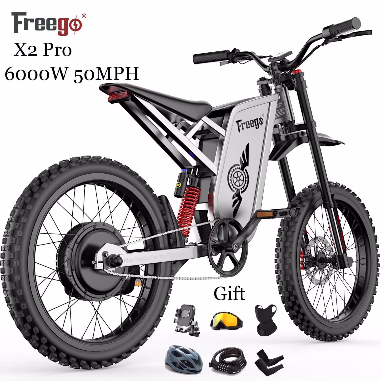 6000W(Peak) Motor 60V/30Ah Battery Freego X2Pro Electric Motorcycle for Adults, Electric Bike ,50MPH/7 Speed Off Road Electric Bicycle,19x2 Full Suspension/Four-Piston Hydraulic Brake UL2849MTB
