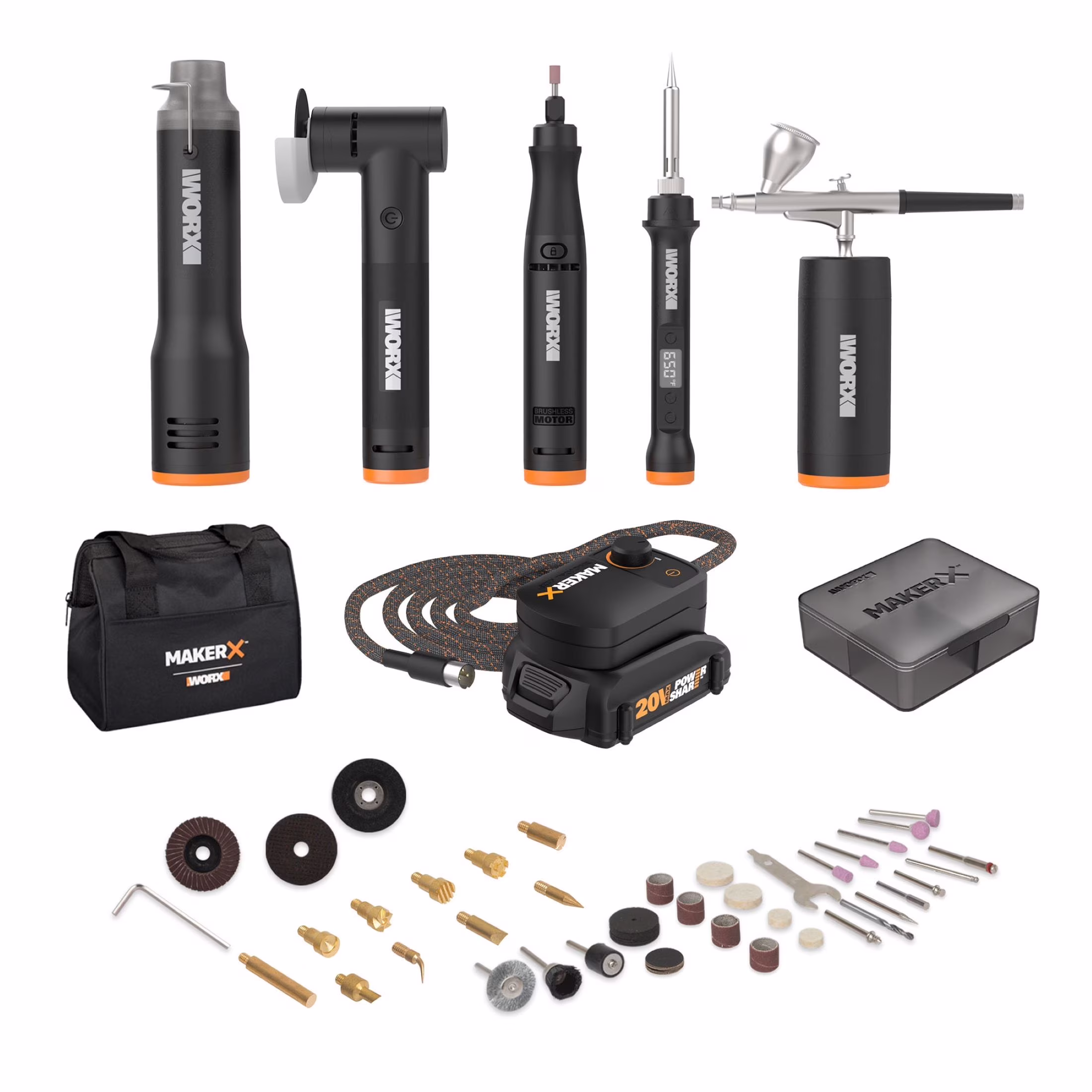 Worx MakerX WX997L 5 Tool Kit with Rotary Tool, Wood & Metal Crafter, Air Brush, Heat Gun, Grinder in Carry Bag (Battery and Charger Included)