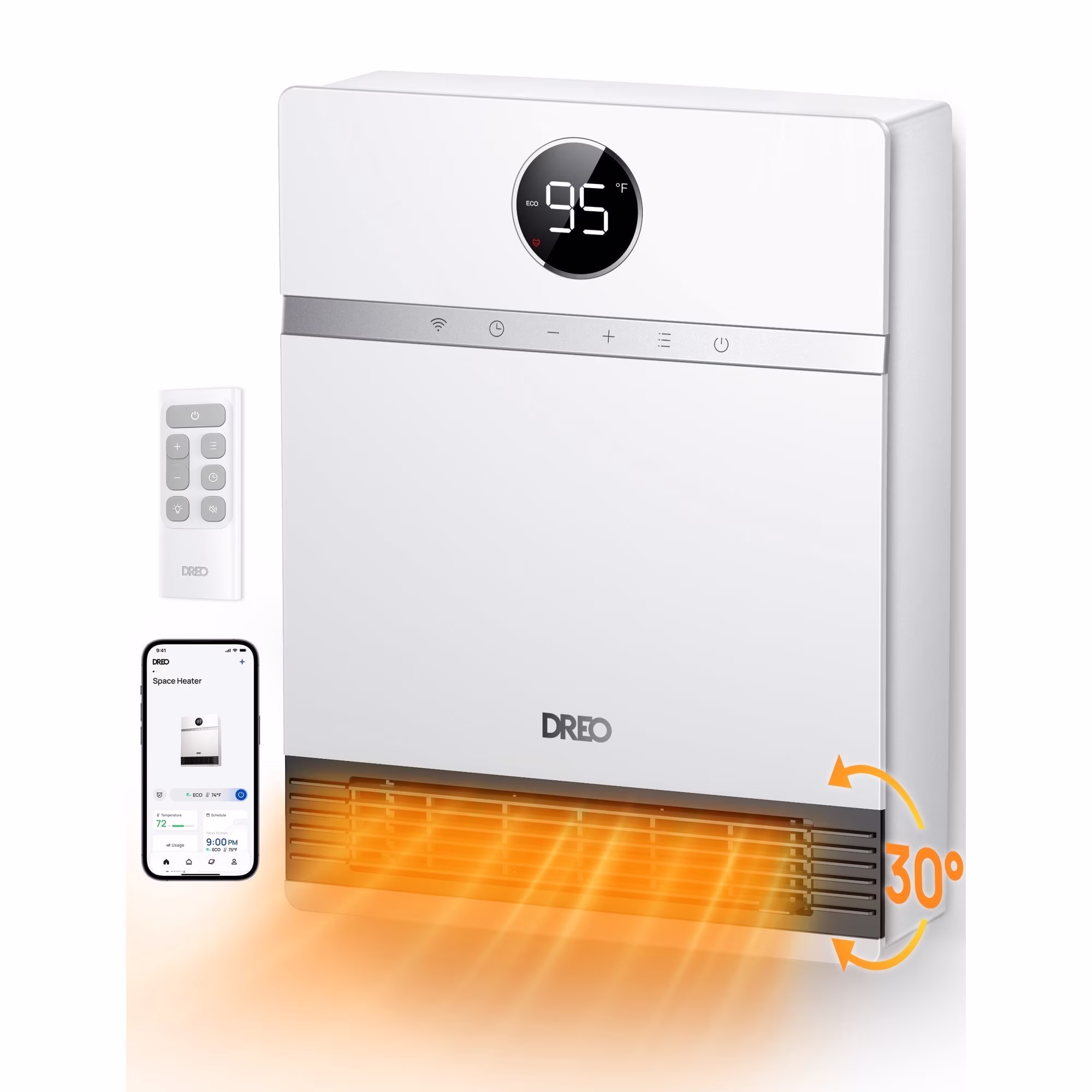 Dreo Smart Wall Heater, IP24 Electric PTC Space for Indoor Use, 30 Oscillation, Adjustable Thermostat, Remote Control, Works With Alexa, 24H Timer, Easy-Mounted for Bedroom, Office